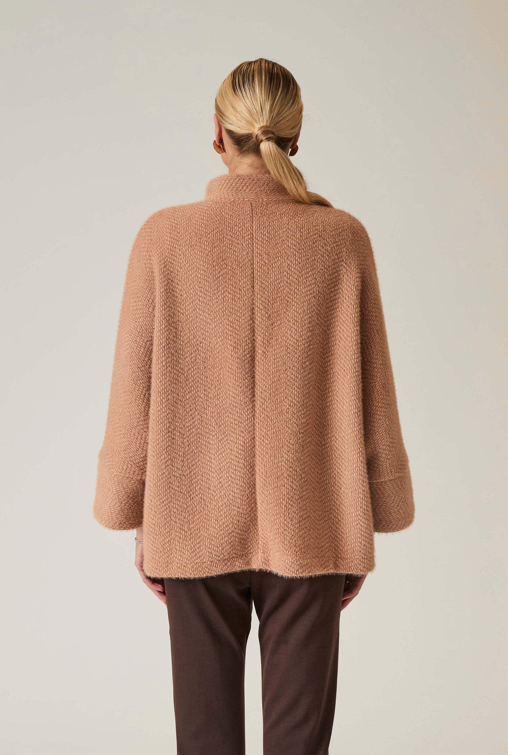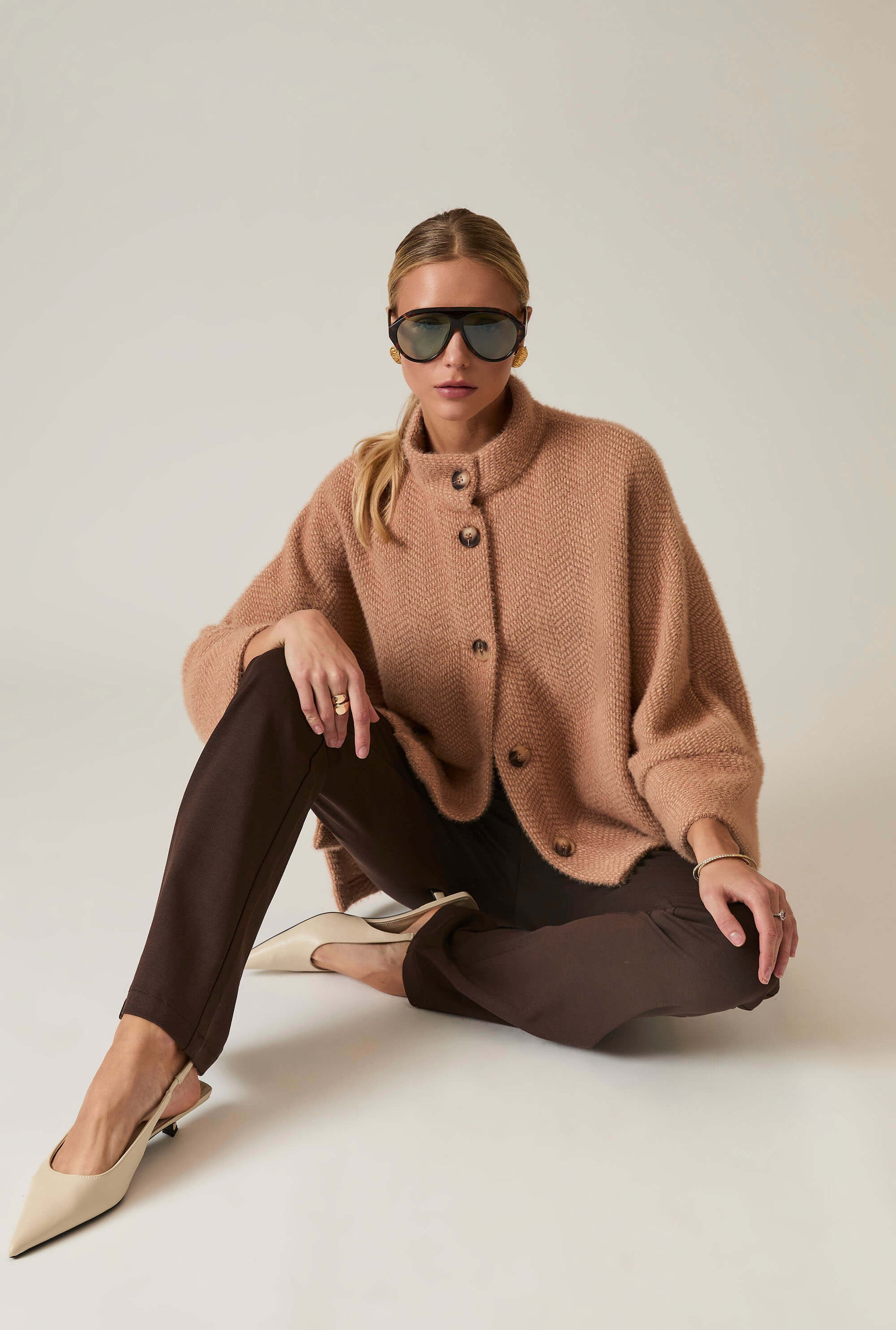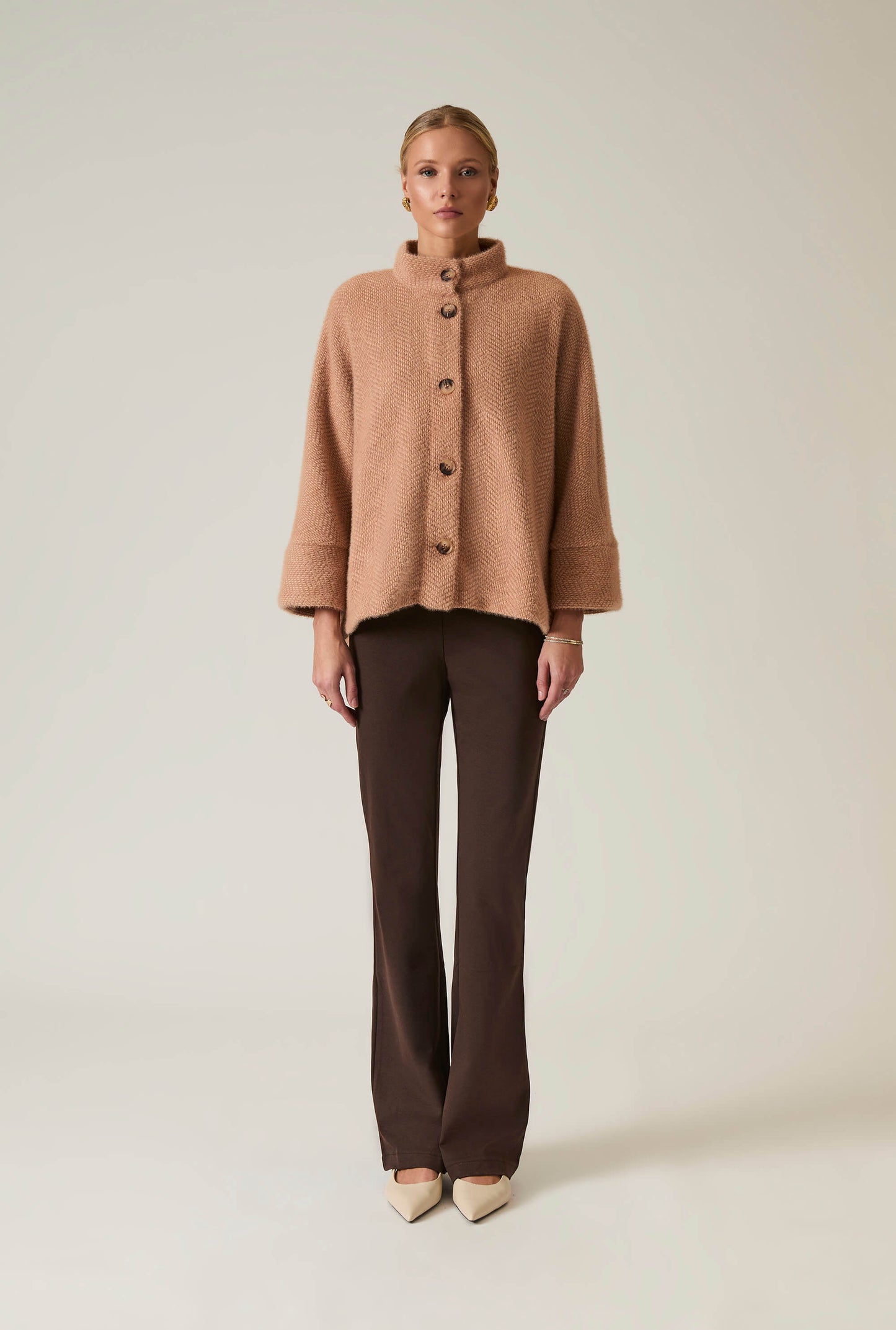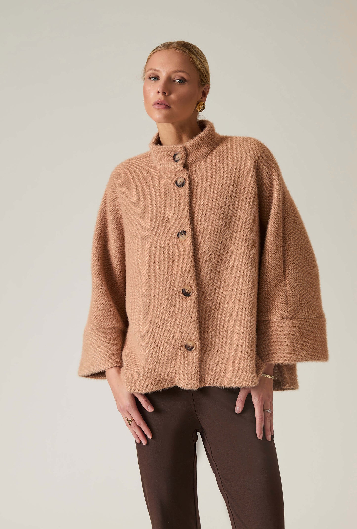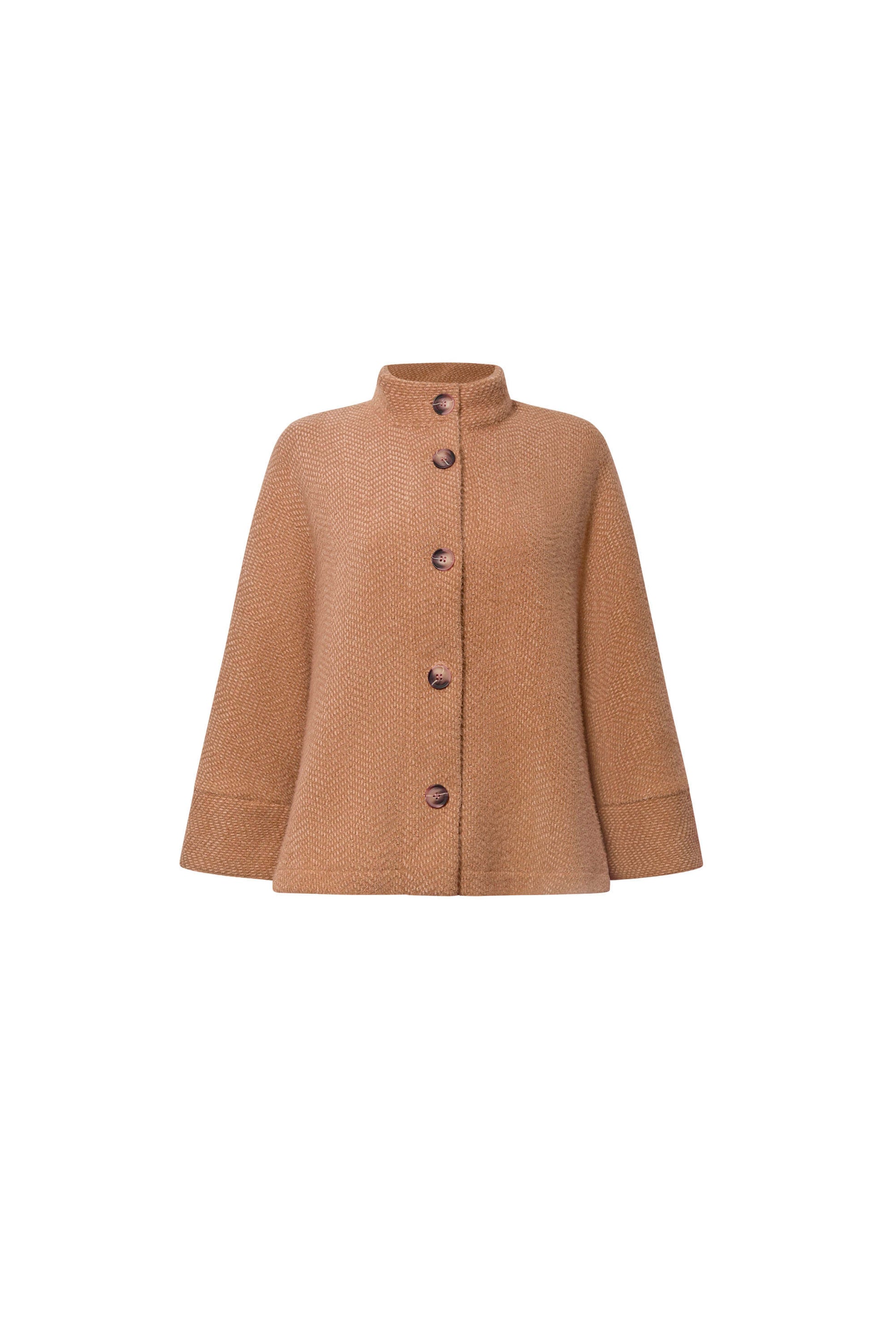 Elevate your style with the James Lakeland Batwing Camel Jacket. Crafted from soft, textured fabric, this relaxed-fit jacket features a high collar, button-down front, and chic batwing sleeves. Perfect for layering, it transitions effortlessly from casual to dressy occasions, offering warmth and elegance.