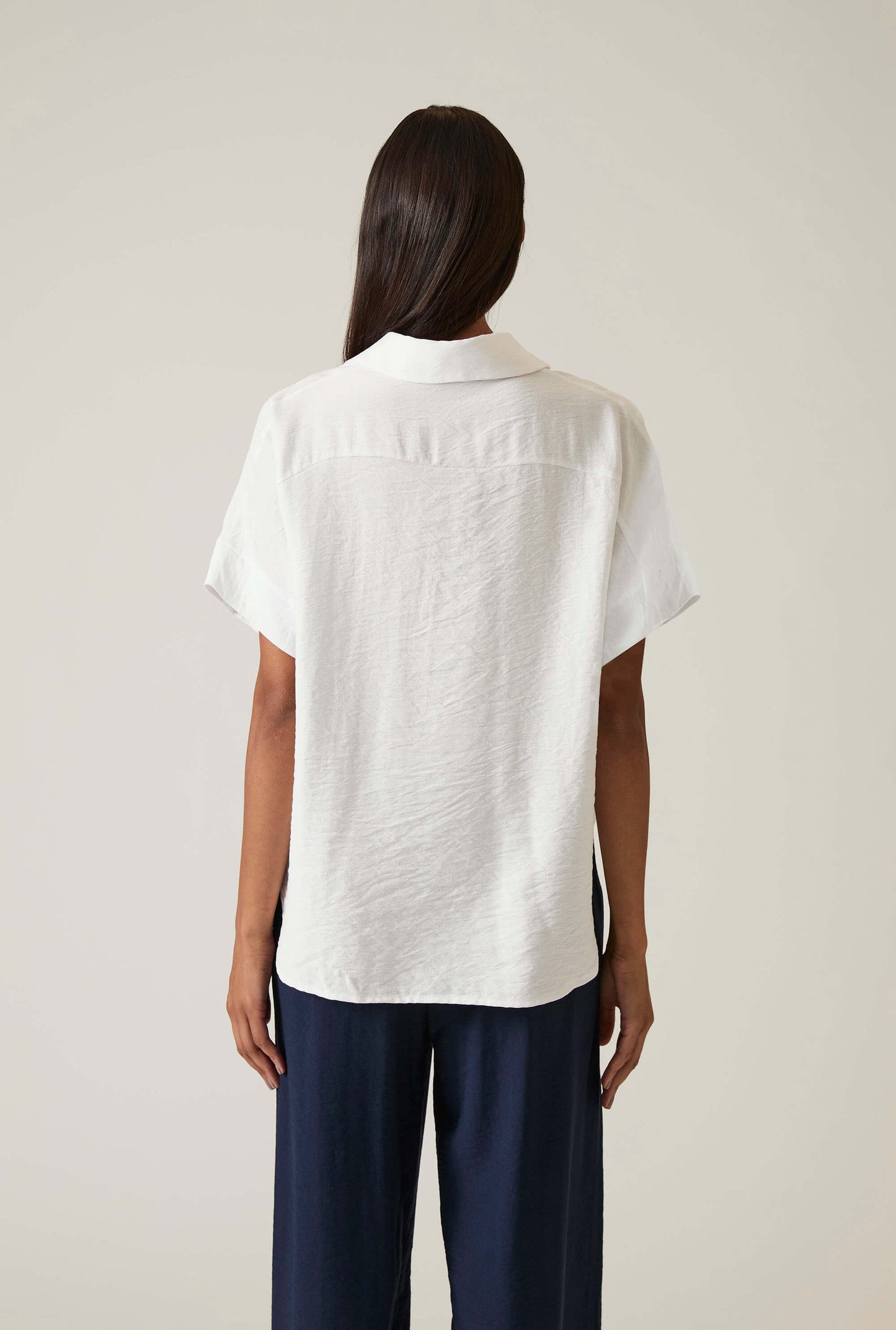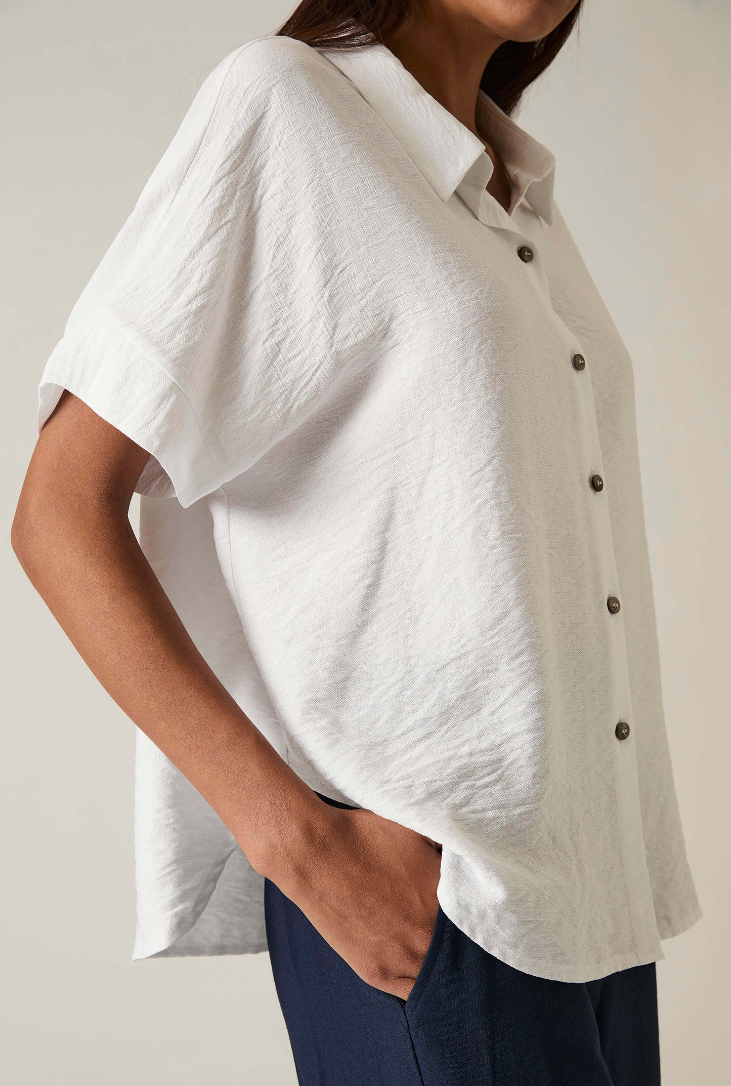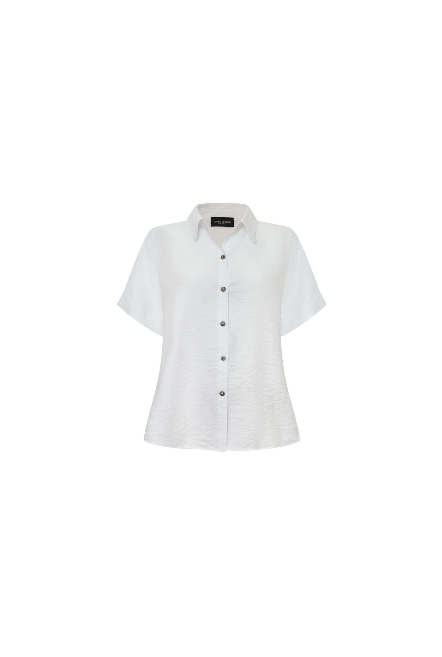 White Textured Button-down Blouse Elevate your wardrobe with this James Lakeland blouse, crafted from crinkled textured fabric. Designed with a structured collar, short sleeves, and a button-down front for timeless polish. A horizontal seam across the upper back enhances the tailored silhouette, while the gently curved hem is slightly longer at the back—adding a touch of modern elegance and extra coverage. Dress it up or keep it relaxed.