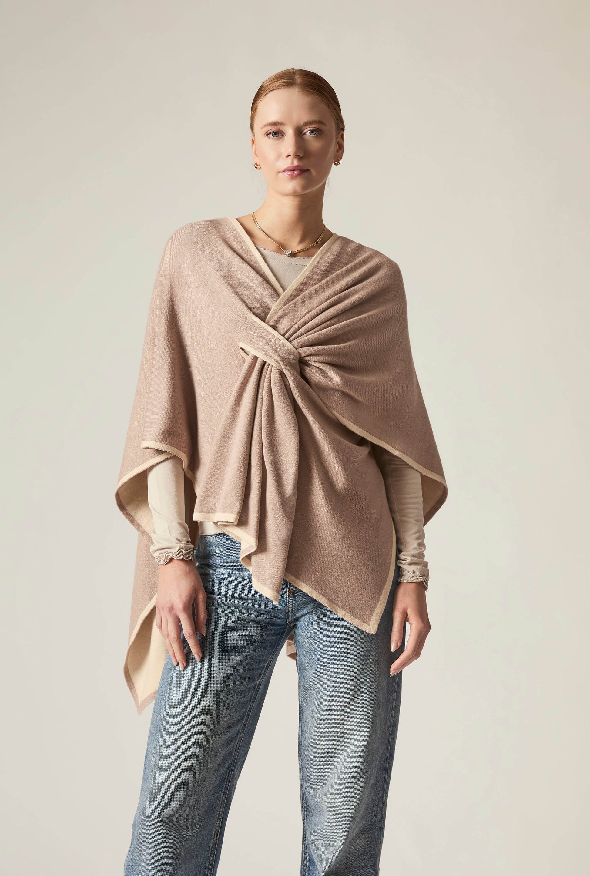 A lightweight beige poncho featuring a signature front‑knot detail that shapes the garment and adds subtle volume. Finished with a contrasting trim, it layers easily over long‑sleeve tops for transitional styling. Soft to the touch and designed for everyday comfort with a polished finish.