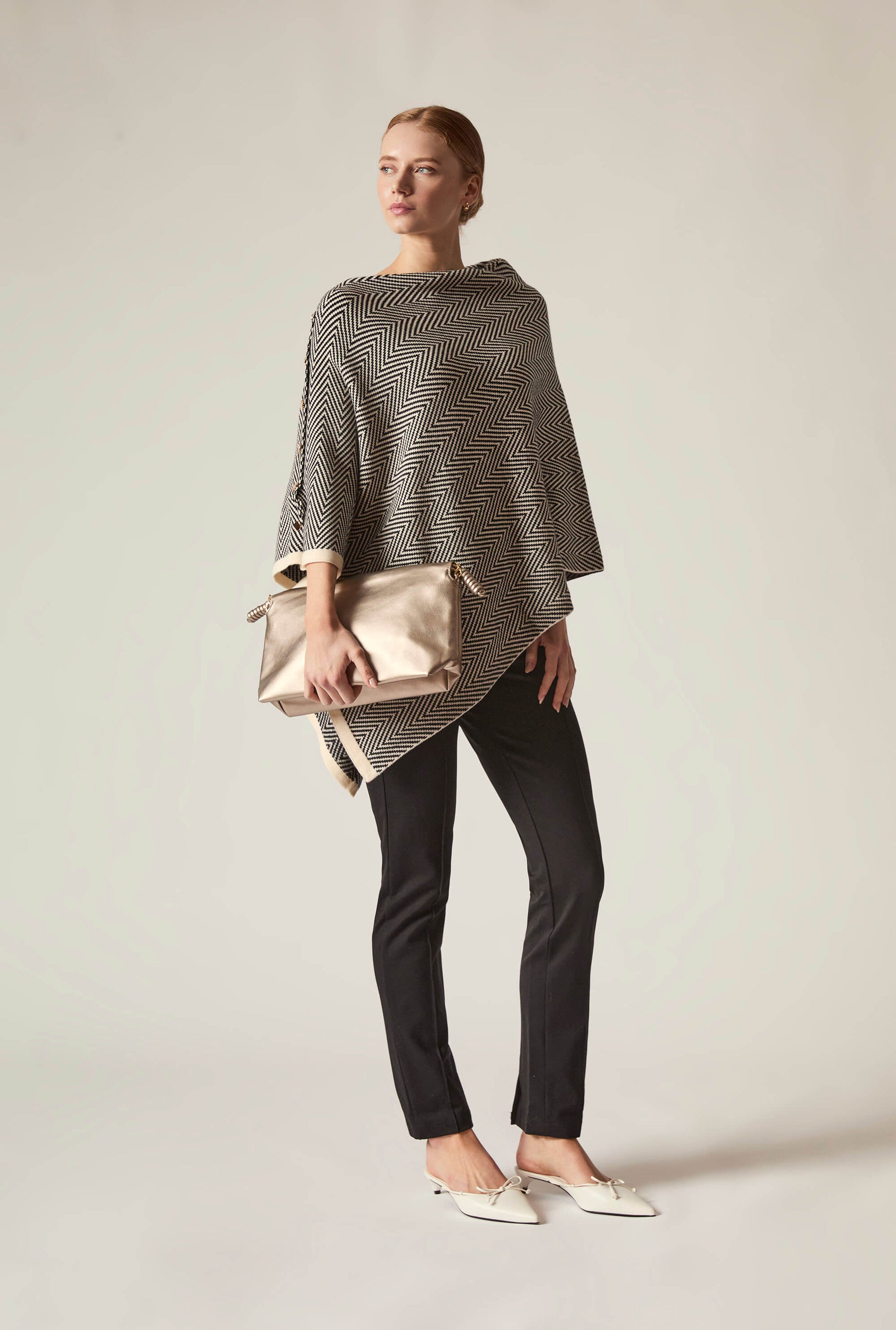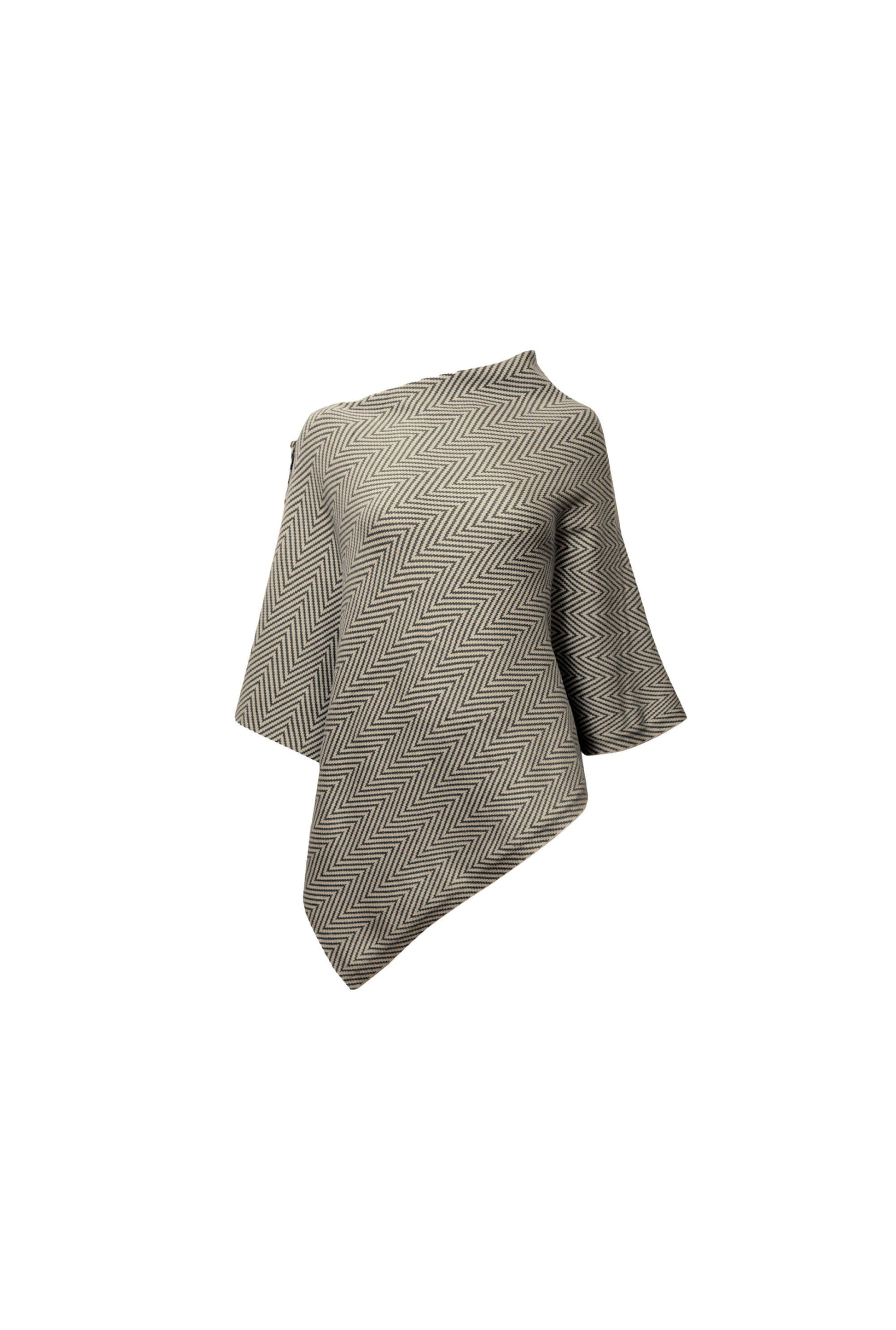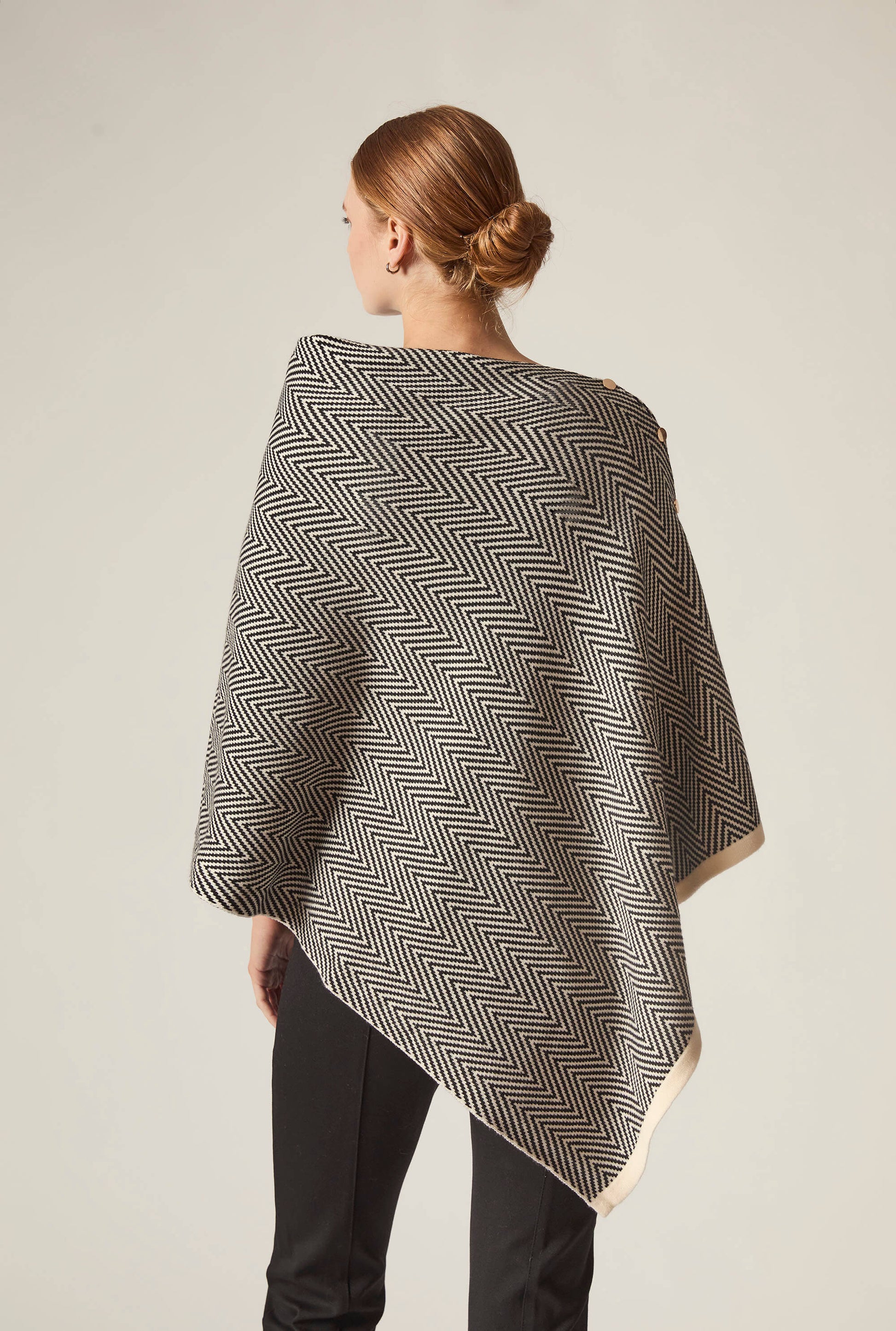 A soft chevron‑textured black poncho with a relaxed drape and elegant side‑button fastening. Its neutral palette and lightweight feel make it perfect for layering through the season, adding effortless James Lakeland sophistication to any outfit.