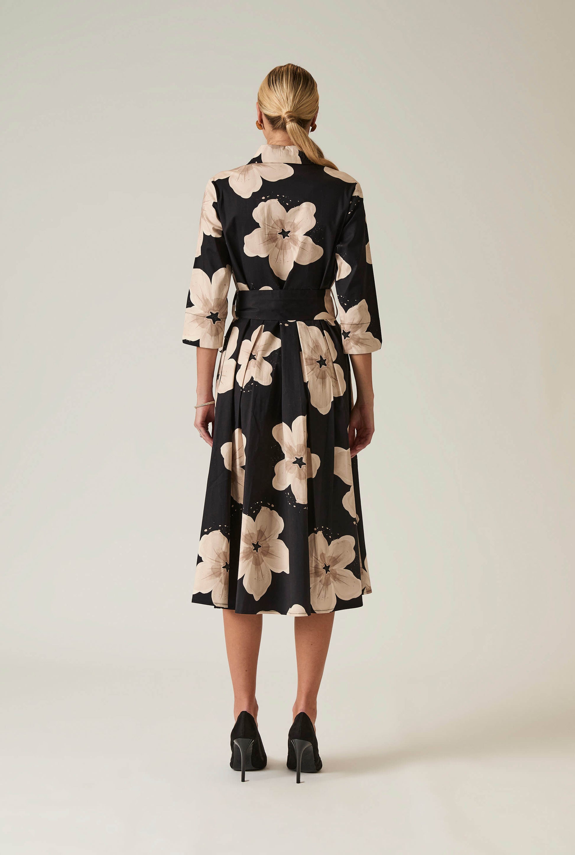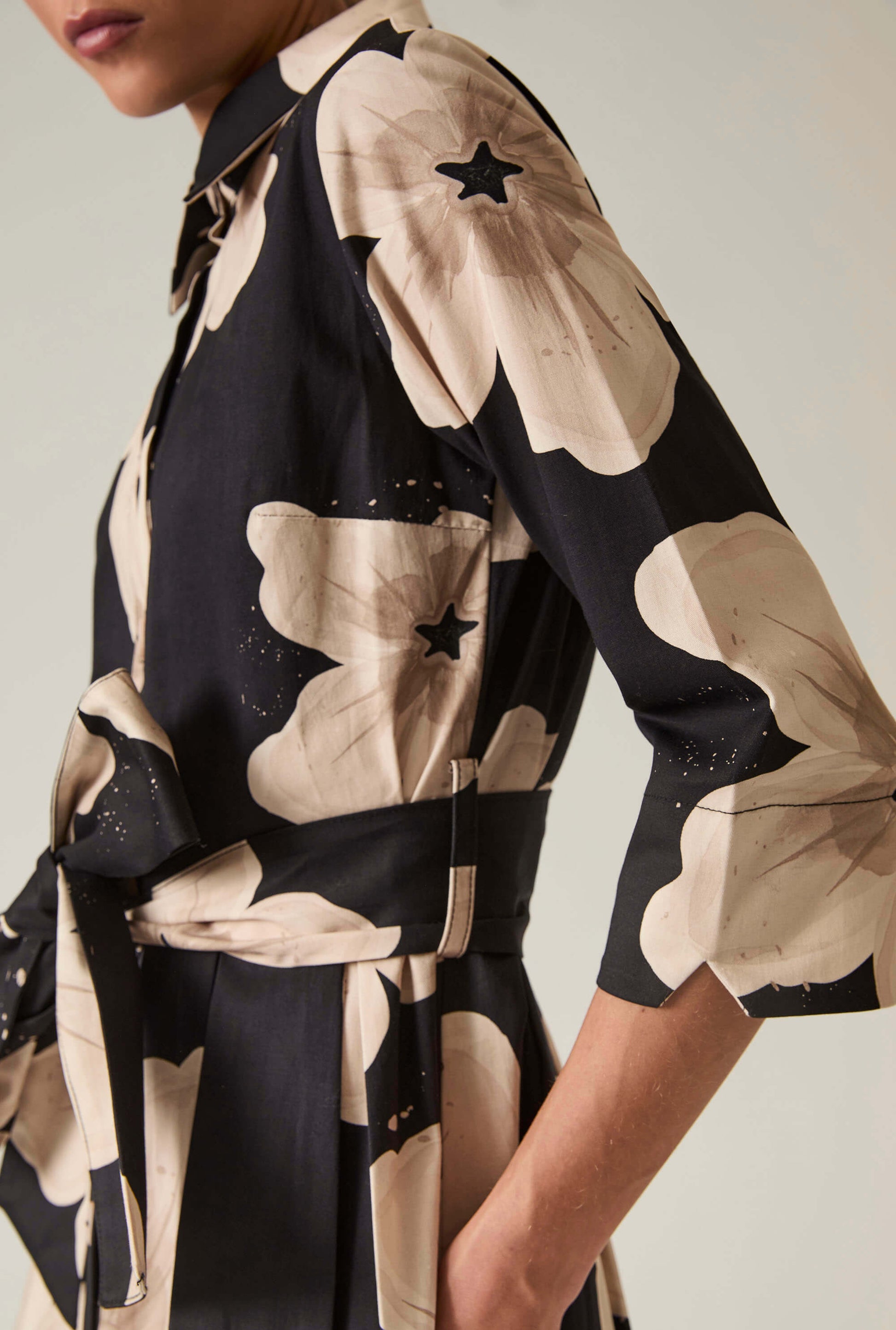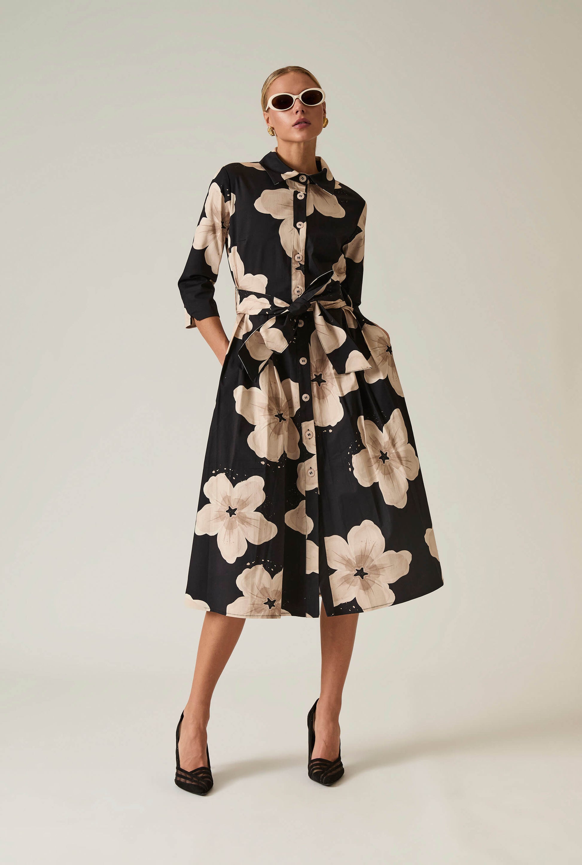Discover the James Lakeland Black Flower Cotton Dress, where comfort meets elegance. Crafted from breathable cotton, this dress features a striking beige floral design on a black background. With a classic collared neckline, front button fastening, three-quarter sleeves, a tie belt that cinches the waist, and two invisible side pockets, it creates a flattering silhouette. Perfect for casual outings or special occasions.