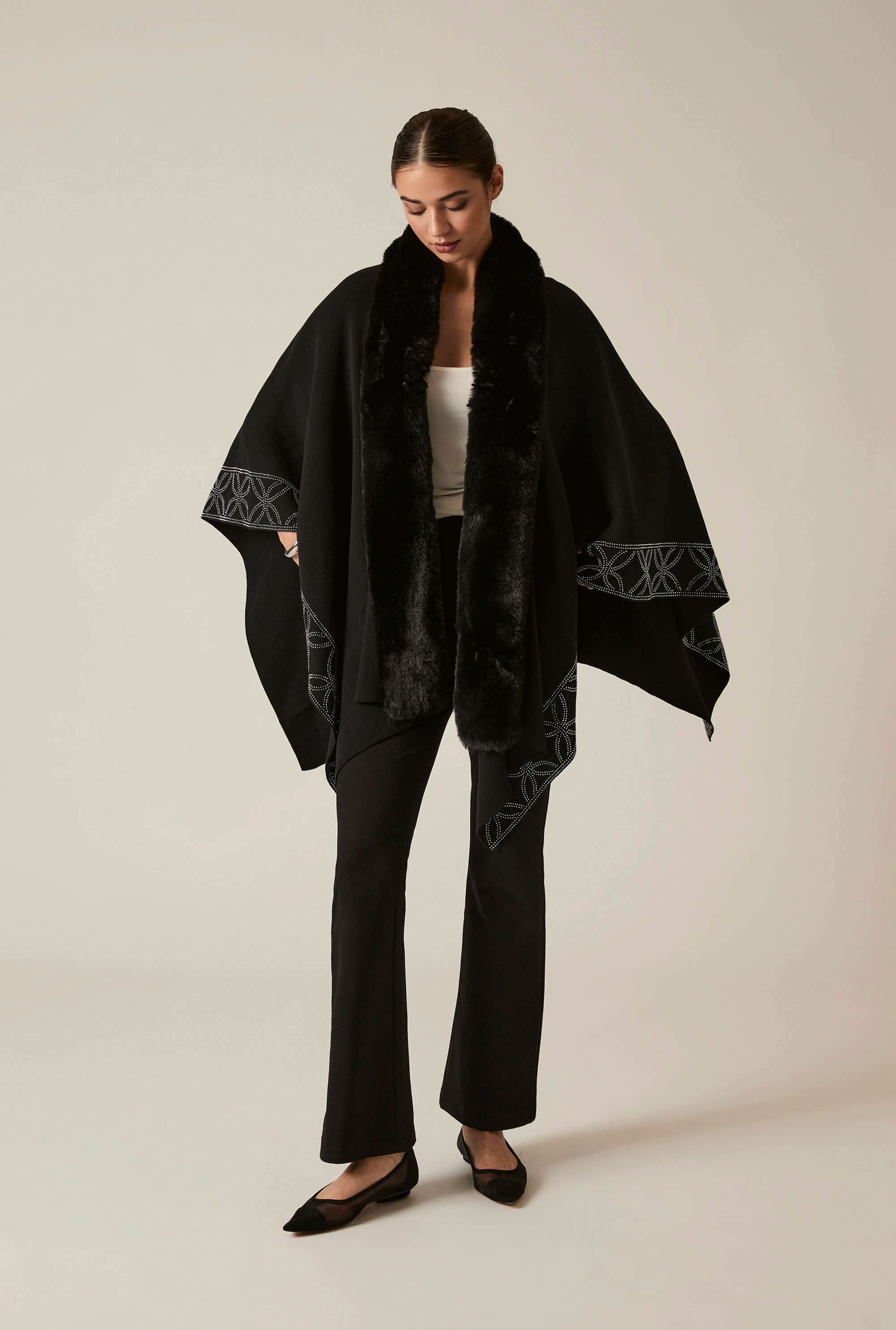 James Lakeland’s Black Faux Fur Poncho is a one-size statement piece with a cotton body and plush faux fur neckline. Sparkling crystals line the hem for added glamour. Though made from cotton, its luxe faux fur collar creates the illusion of winter warmth and elegance.
