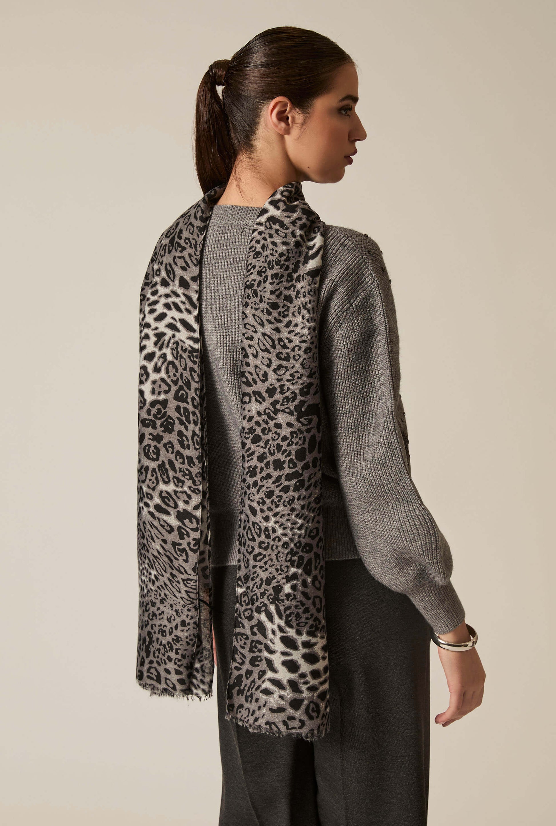 Elevate your style with this light and ultra-soft James Lakeland scarf. It has a chic leopard print on a two-tone background and boasts raw frayed edges that complement its bold design. Perfect for a casual yet sophisticated look, tie it around your neck or drape it over your shoulders.