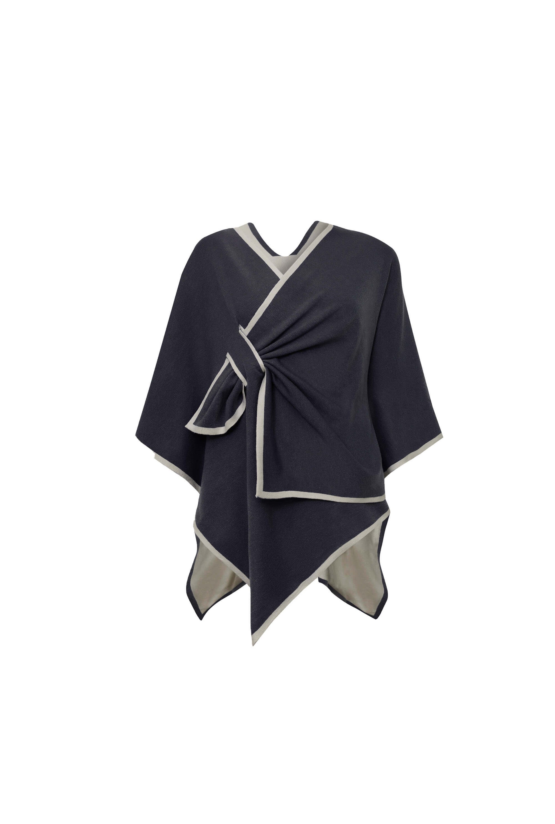A lightweight navy poncho featuring a signature front‑knot detail that shapes the garment and adds subtle volume. Finished with a contrasting trim, it layers easily over long‑sleeve tops for transitional styling. Soft to the touch and designed for everyday comfort with a polished finish.