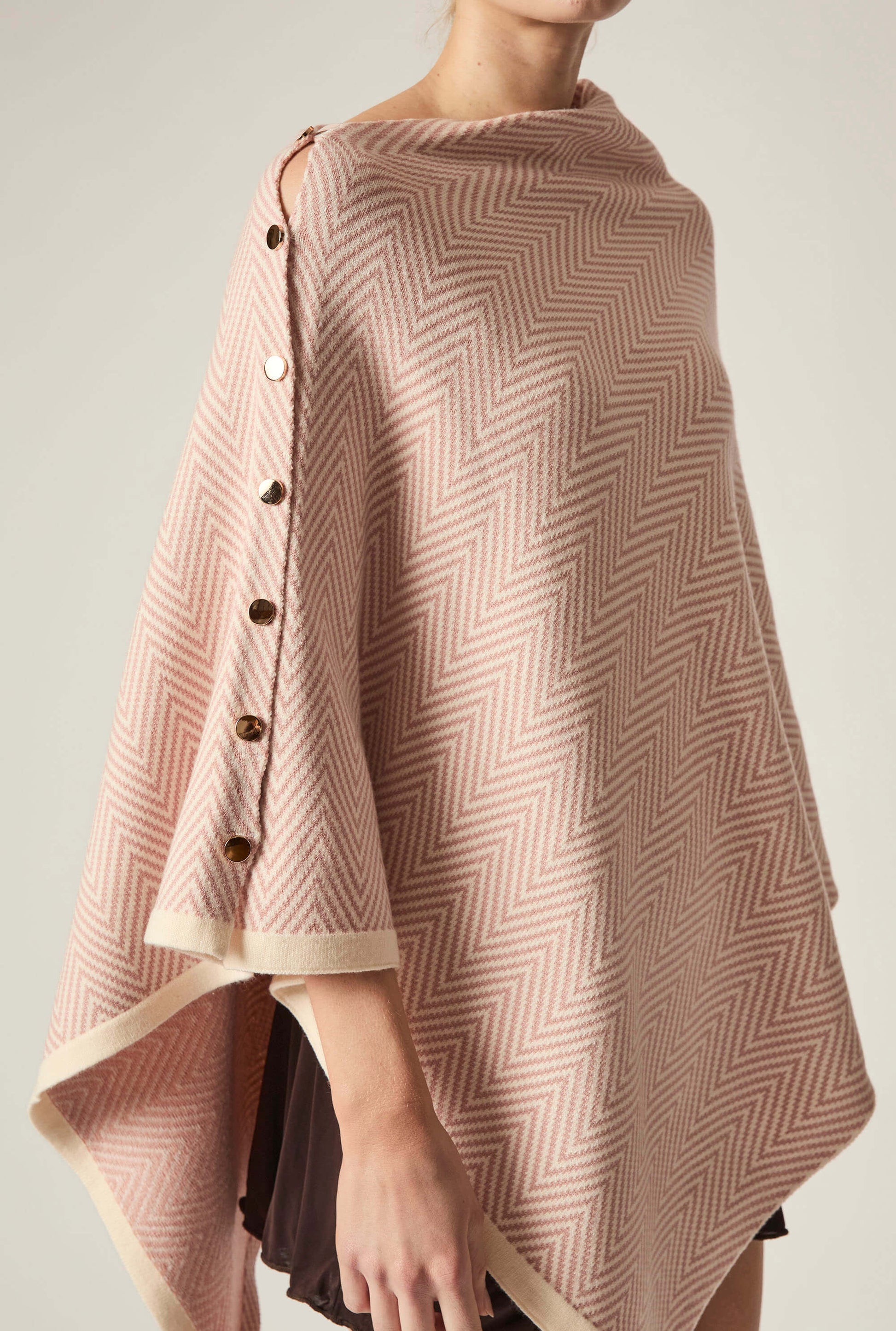 A soft chevron‑textured pale pink poncho with a relaxed drape and elegant side‑button fastening. Its neutral palette and lightweight feel make it perfect for layering through the season, adding effortless James Lakeland sophistication to any outfit.