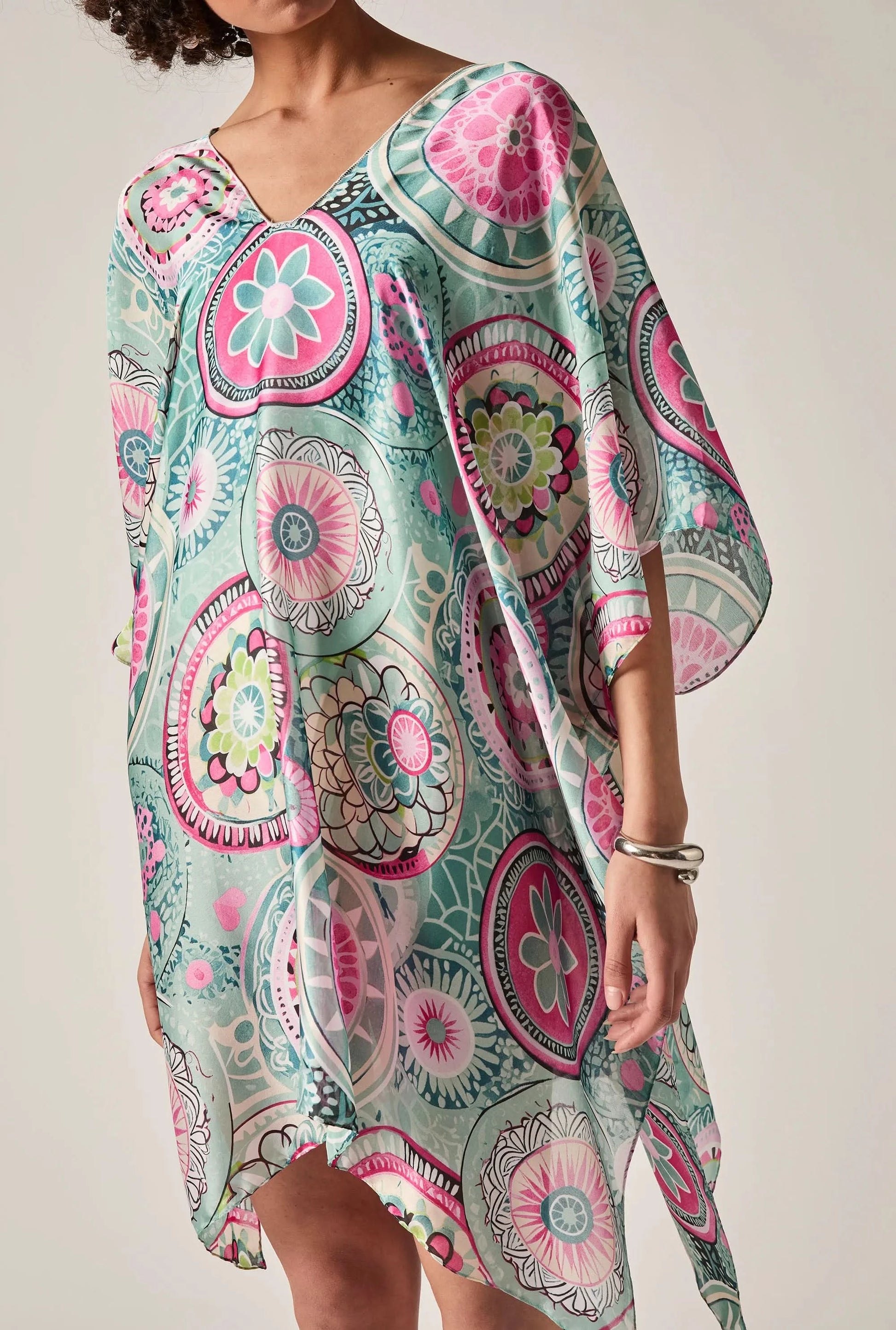 A stunning free-flowing kaftan in a soft turquoise, pink and green mandala print, crafted from a luxurious silk mix. The V-neckline and relaxed silhouette drape beautifully — effortlessly worn as a beach cover-up or styled for a relaxed day or evening look.