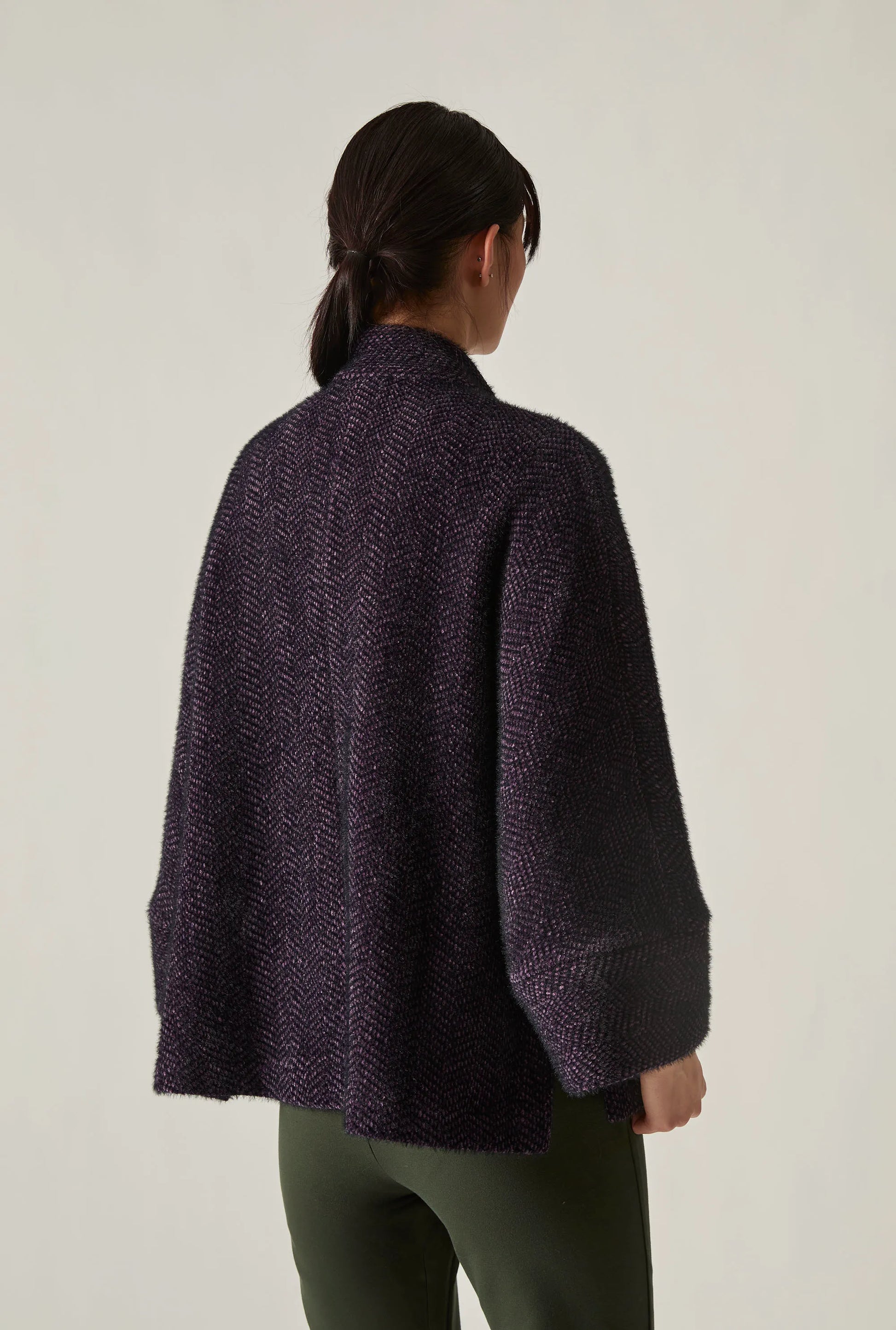 A relaxed-fit batwing jacket in black and purple, crafted in Italy from a soft textured fabric. The high collar and button-down front with contrast button detailing create an elegant silhouette, whilst the batwing sleeves add effortless style.