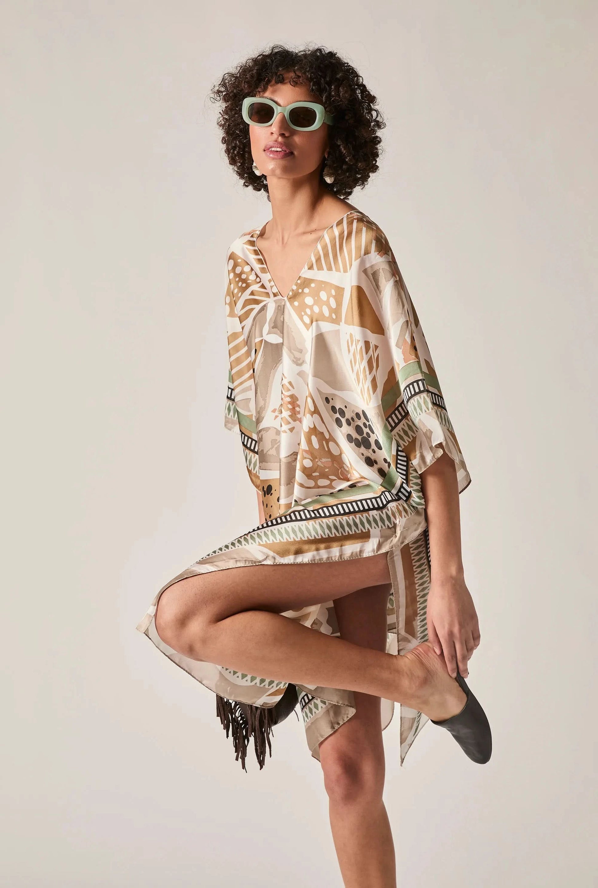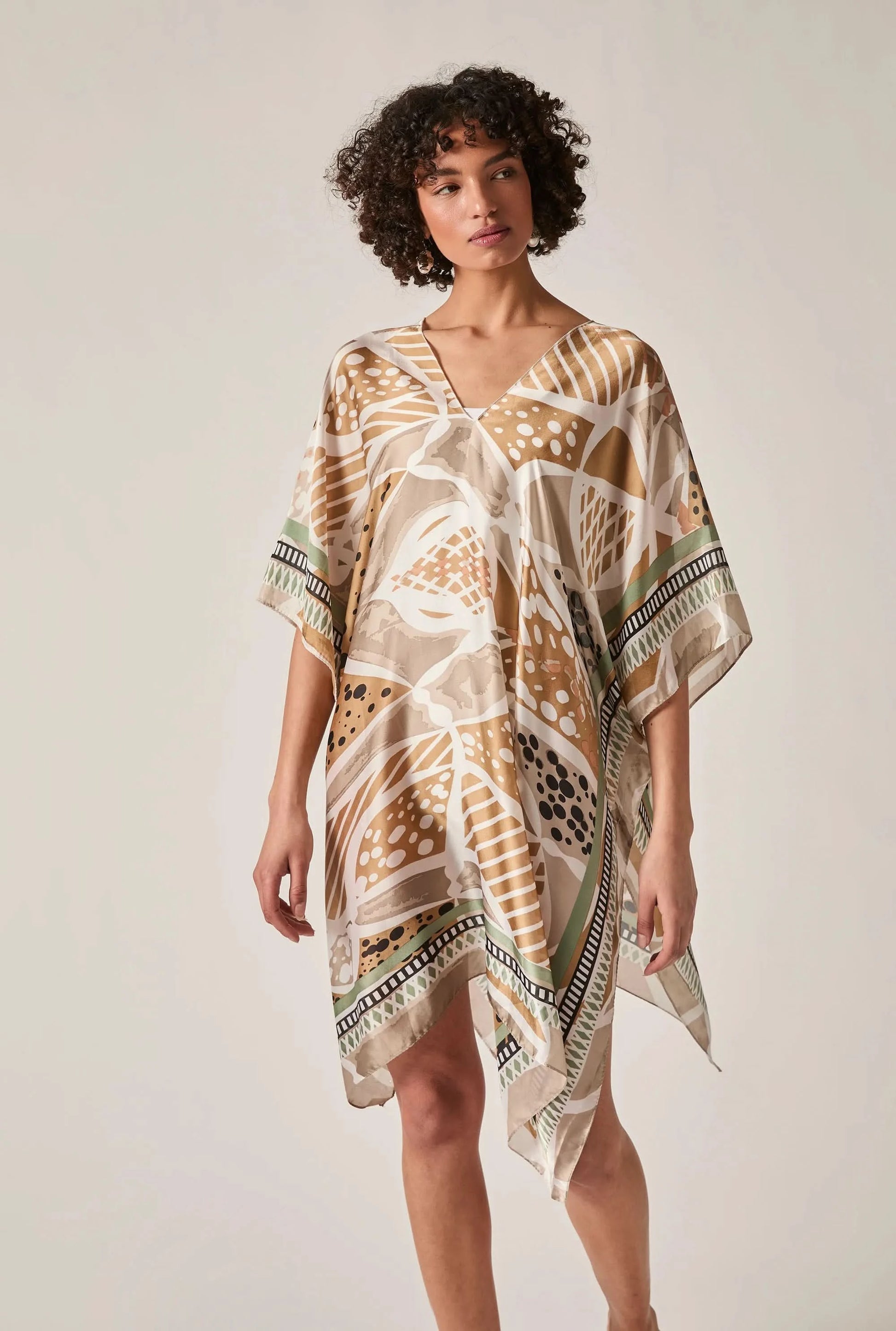 A free-flowing kaftan in a bold petal mosaic print, crafted from a luxurious silk mix. Warm beige and gold geometric shapes are grounded by white and lifted by sage green accents, with a striking tribal border trim. Wear as a beach cover-up or style with sandals for an effortless summer look.