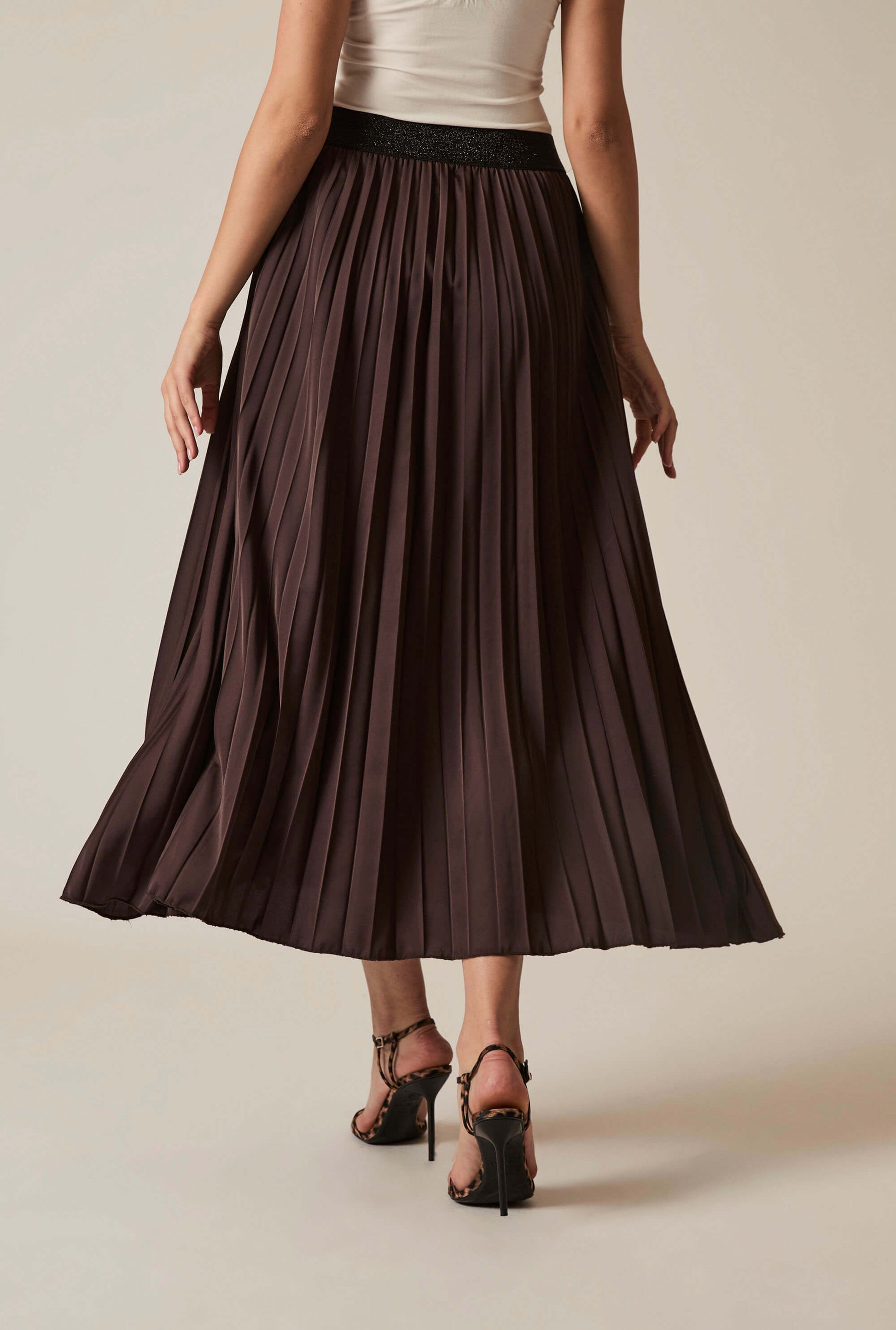 James Lakeland brown pleated maxi skirt with high waist and textured waistband. Crisp vertical pleats create elegant movement and an A-line silhouette with a relaxed, flowing fit. A versatile piece for refined daywear or elevated evening looks.