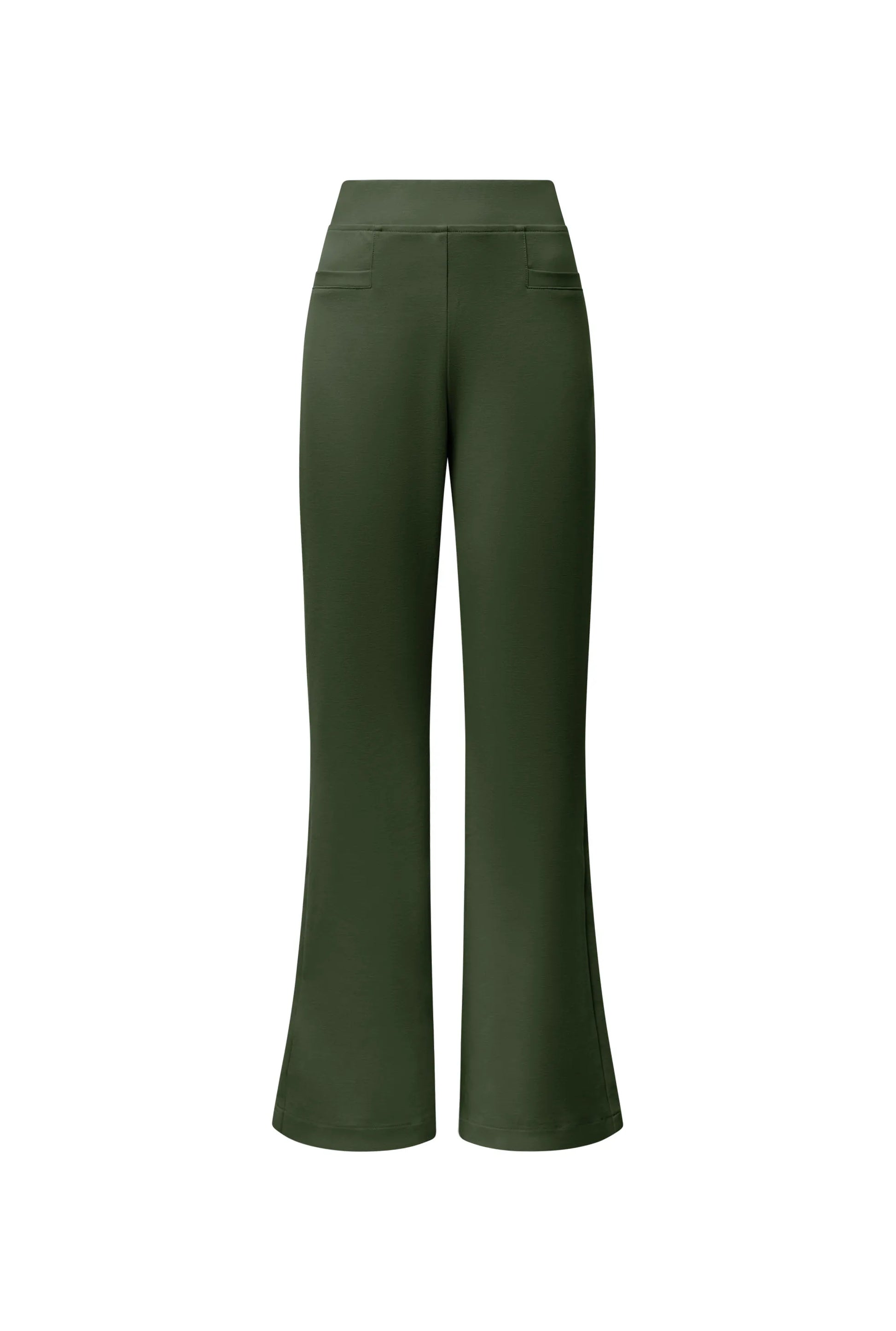 Tailored bootleg trousers in khaki, crafted in Italy from a stretch fabric blend. The high-rise elasticated waistband and sleek fit through the thigh create a flattering silhouette, whilst the subtle flare from the knee adds elegant movement.