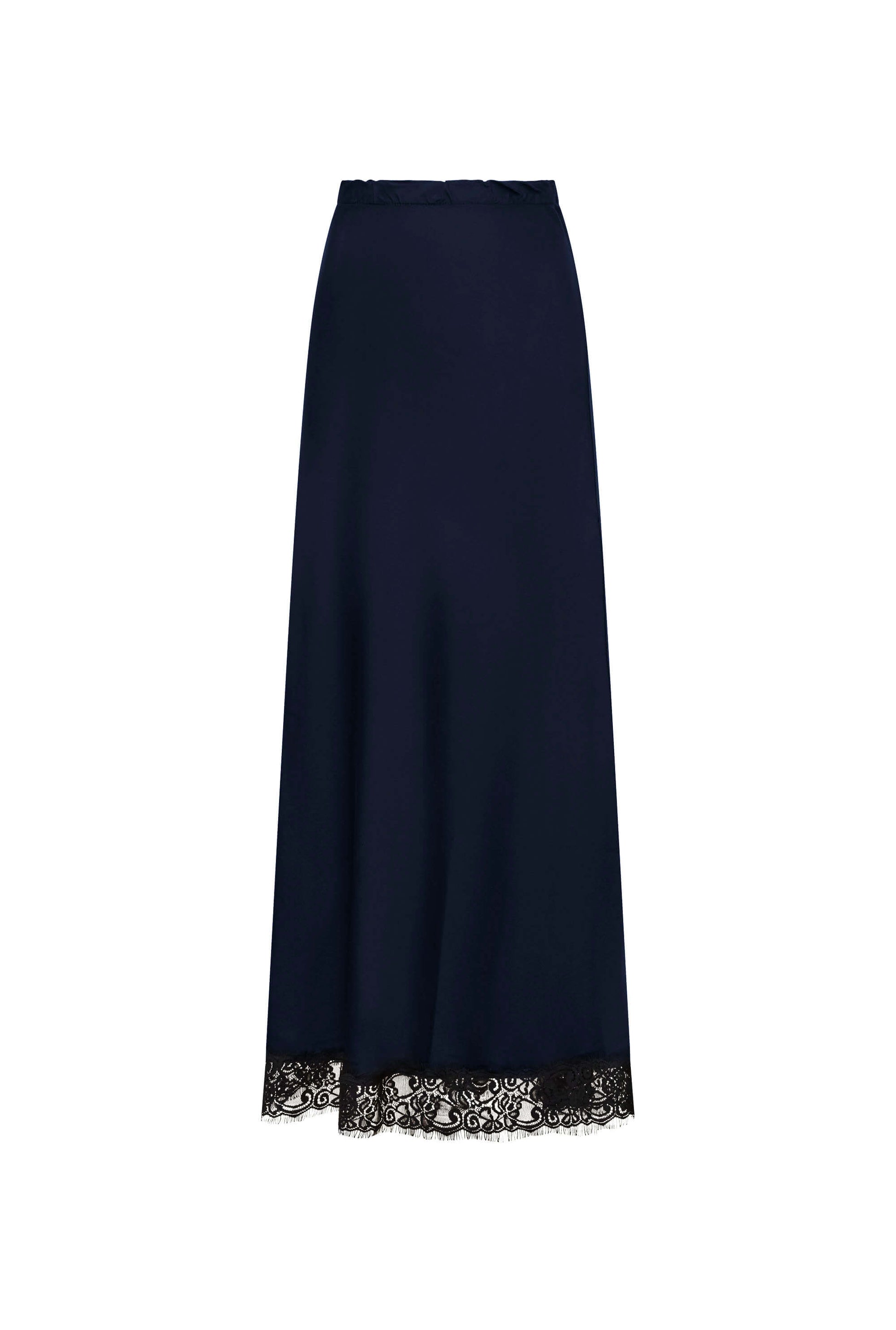 Elegant and refined, this navy satin maxi skirt by James Lakeland features a sleek, body-skimming silhouette and a dedicated lace trim at the bottom hem. The soft sheen of the fabric adds fluidity and movement, while the high-waisted cut enhances the feminine shape.