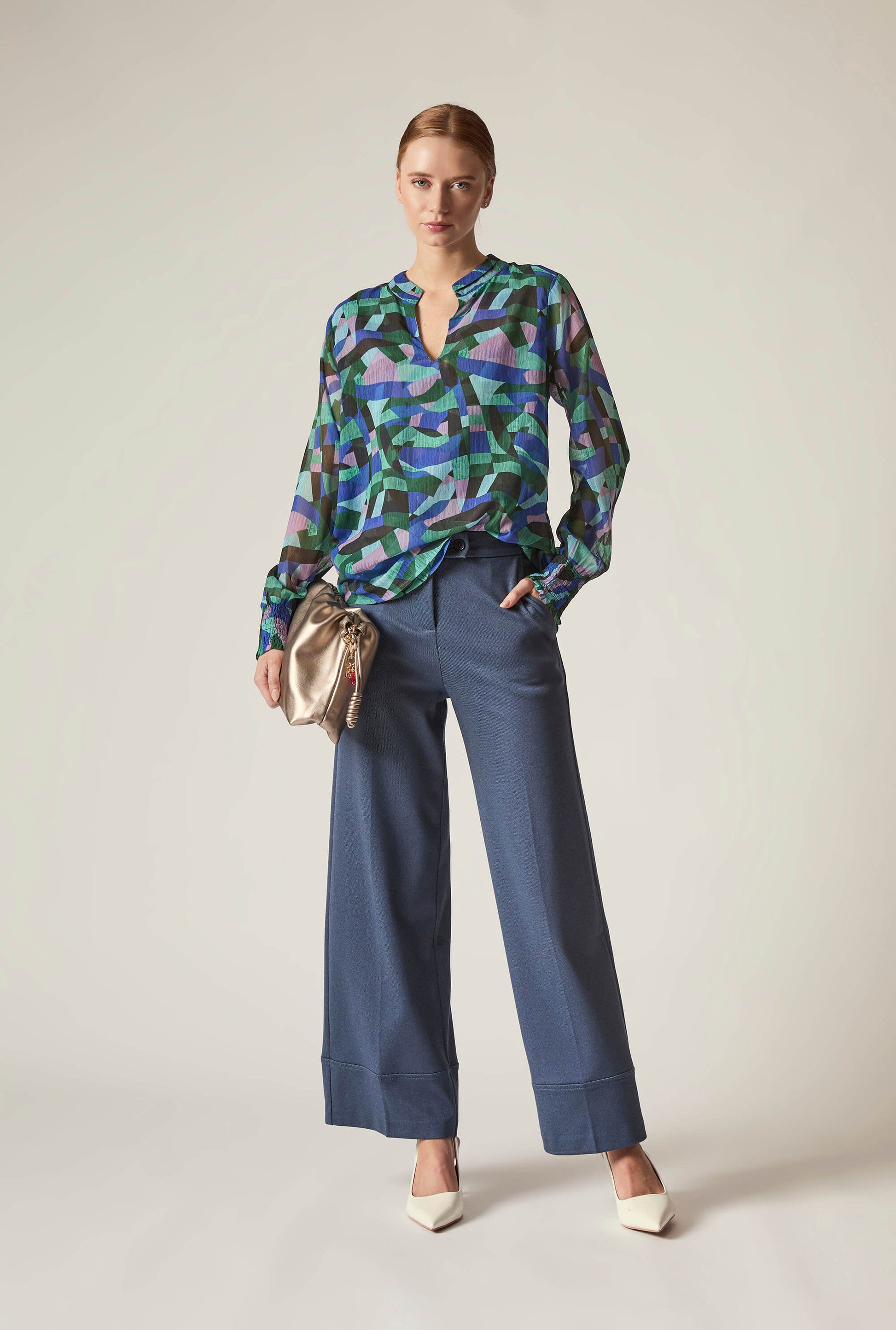 James Lakeland blouse with a vibrant abstract print in fresh greens, blues, purples, and black. Featuring a split V‑neck, long sleeves, and a relaxed, flowing silhouette, it drapes beautifully for effortless, modern elegance.