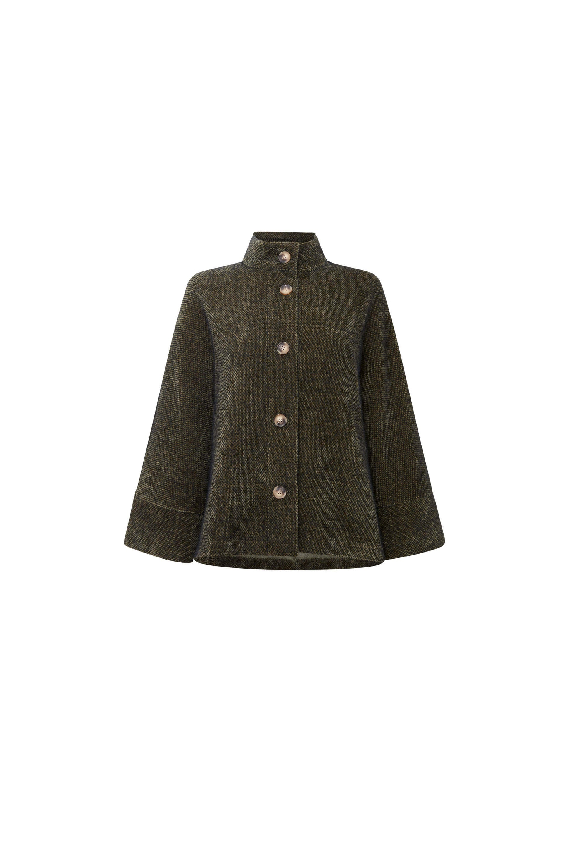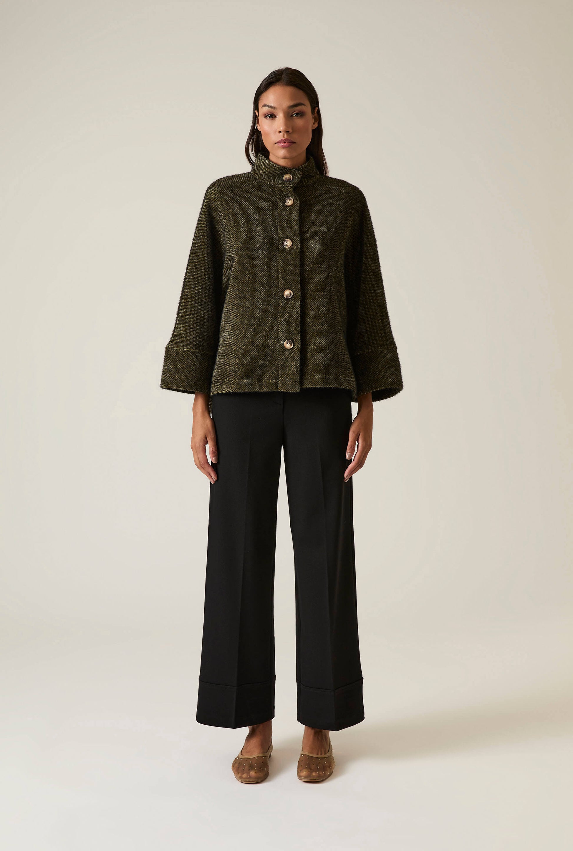 Elevate your style with the James Lakeland Batwing Dark Green Jacket. Crafted from soft, textured fabric, this relaxed-fit jacket features a high collar, button-down front, and chic batwing sleeves. Perfect for layering, it transitions effortlessly from casual to dressy occasions, offering warmth and elegance.