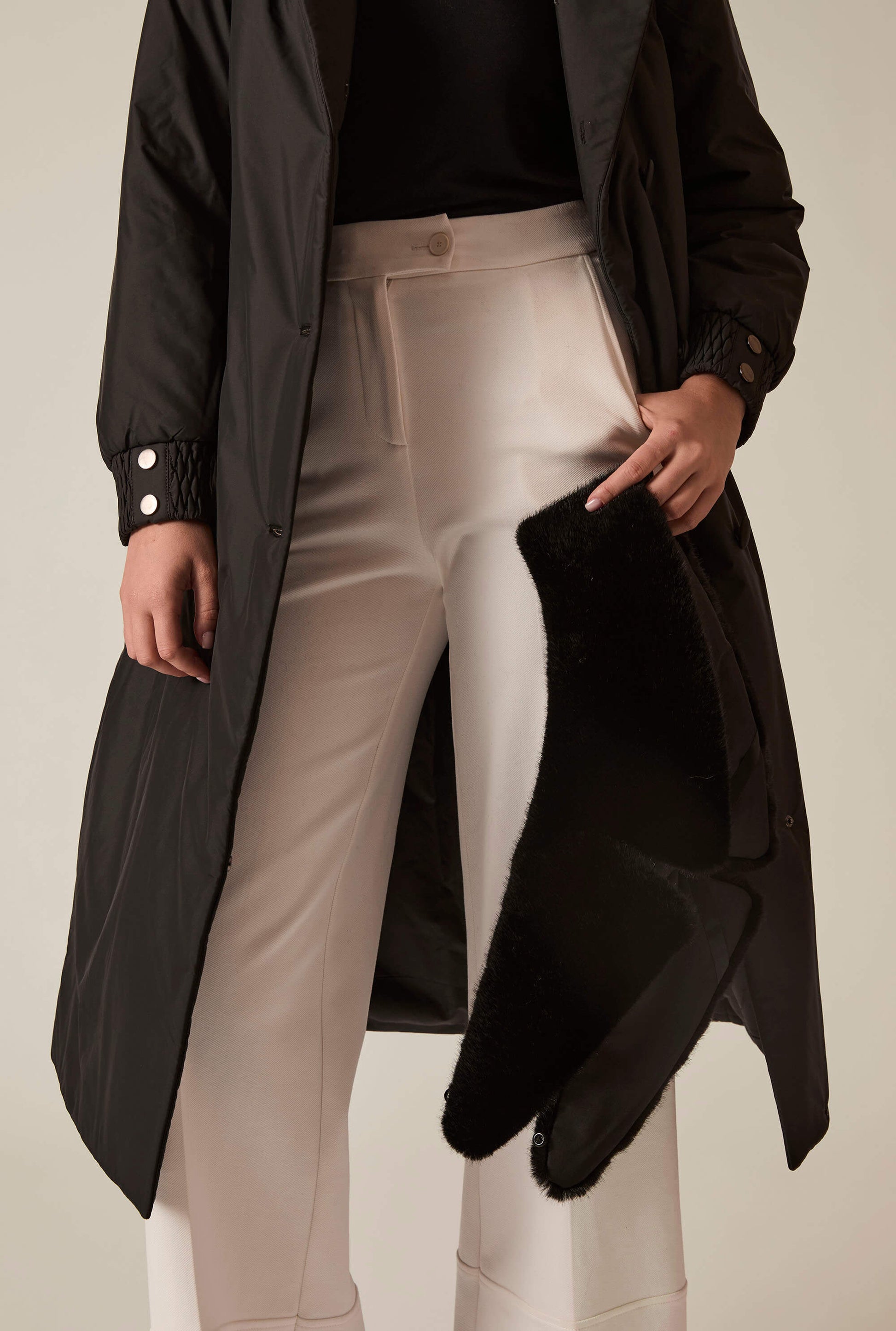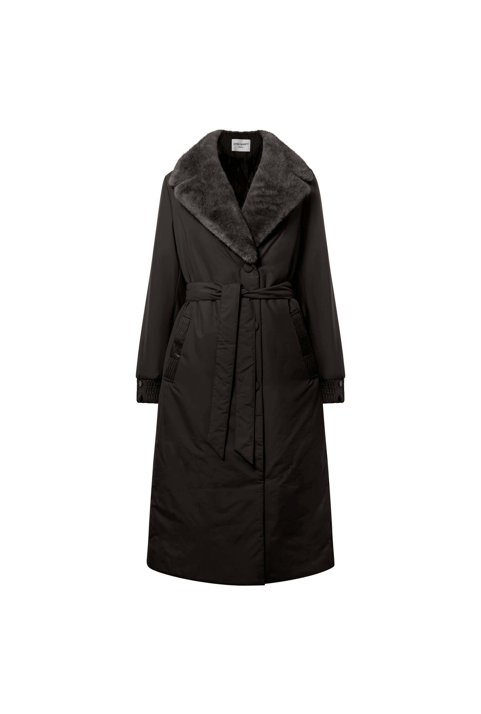 James Lakeland’s black winter coat features a lustrous shell and a detachable faux fur shawl collar for versatile styling. With a belted waist, button fastening, and quilted cuffs finished with sculptural button tabs, it’s a polished cold-weather essential with textural contrast.