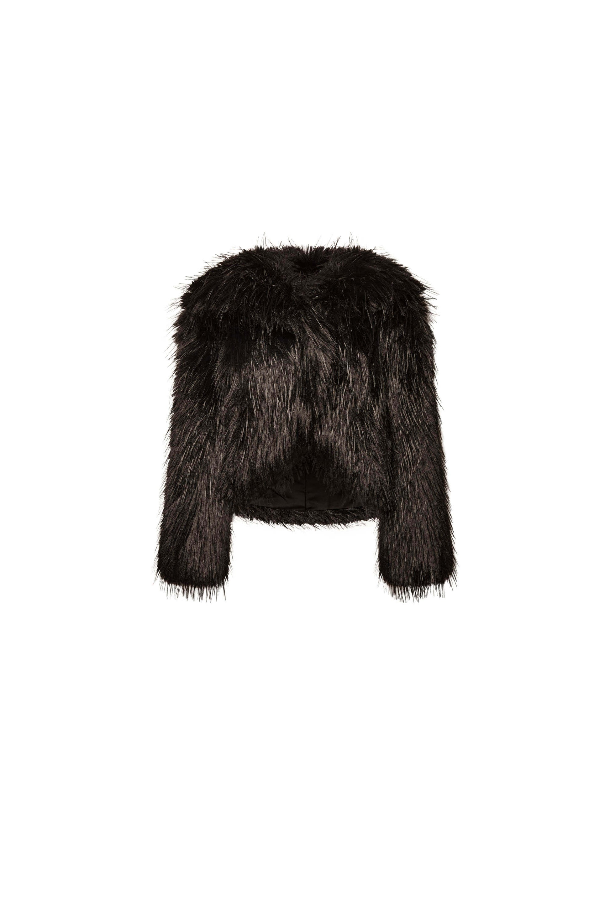 James Lakeland’s black shaggy faux fur jacket makes a bold statement with its voluminous, long-haired texture. Cropped in length with a relaxed silhouette, it fastens with two top-positioned hooks and features discreet side pockets. A plush, fashion-forward layer with tactile impact.