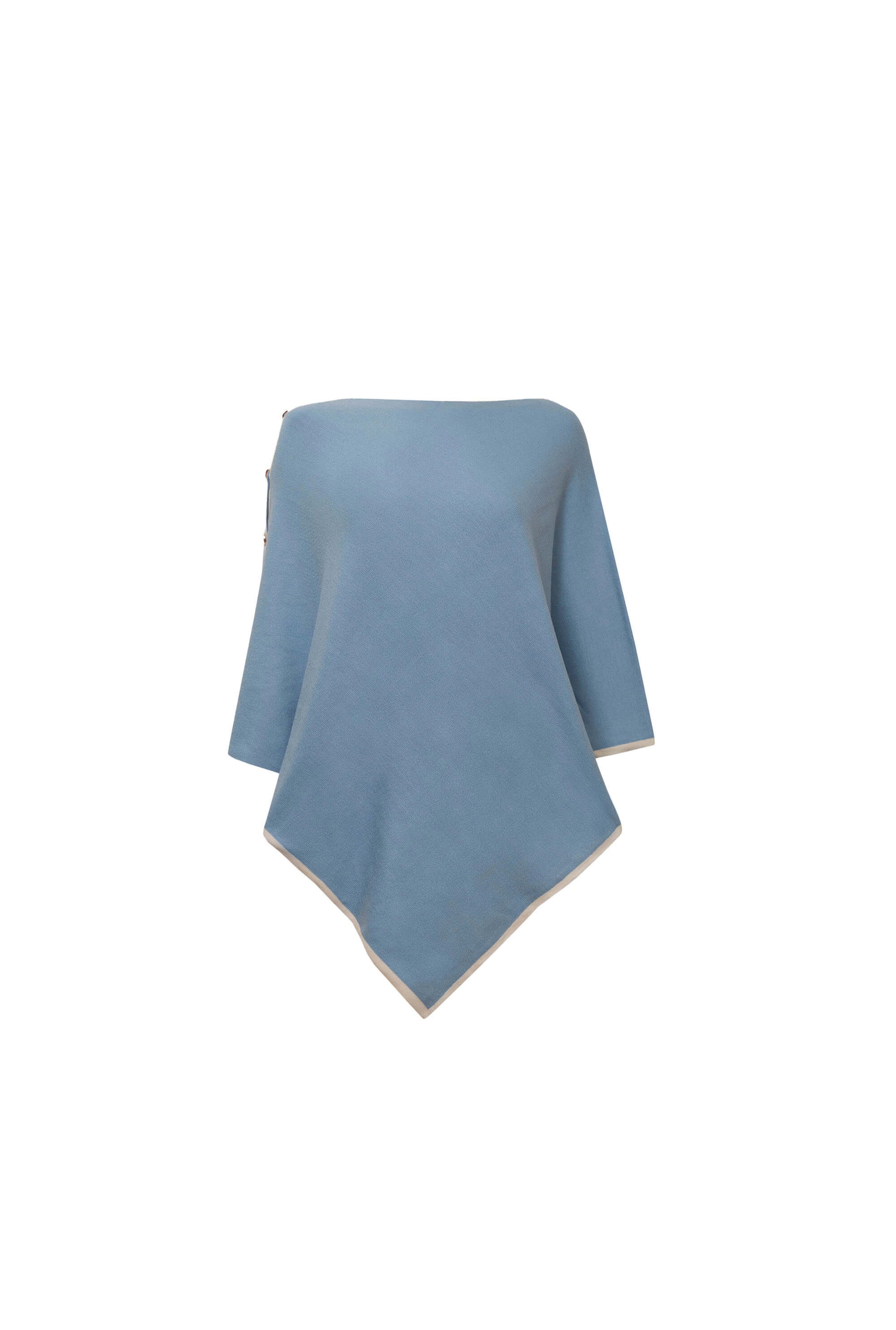 A soft pale blue James Lakeland one‑size poncho top with an elegant asymmetrical drape, contrast trim, and signature button detailing along the shoulder and side. Lightweight and versatile, it layers effortlessly for modern, refined style.