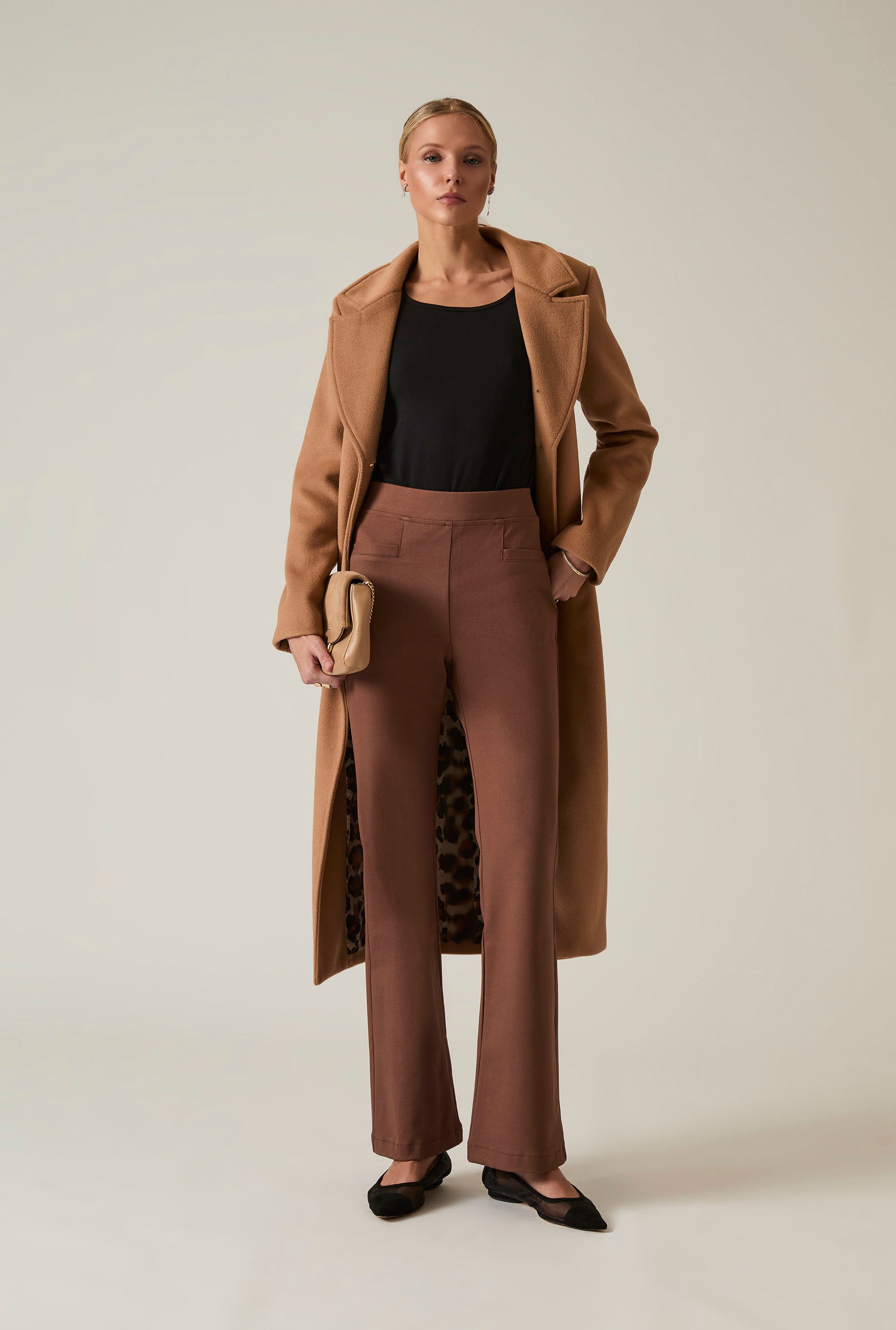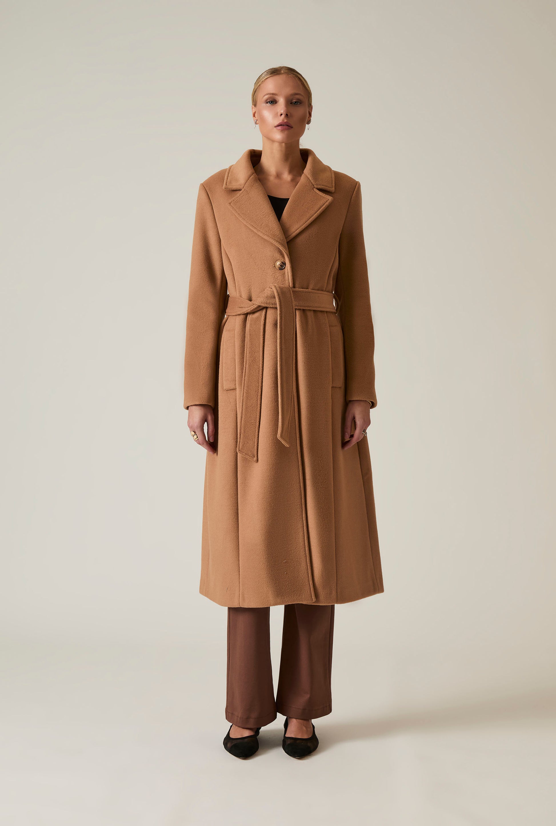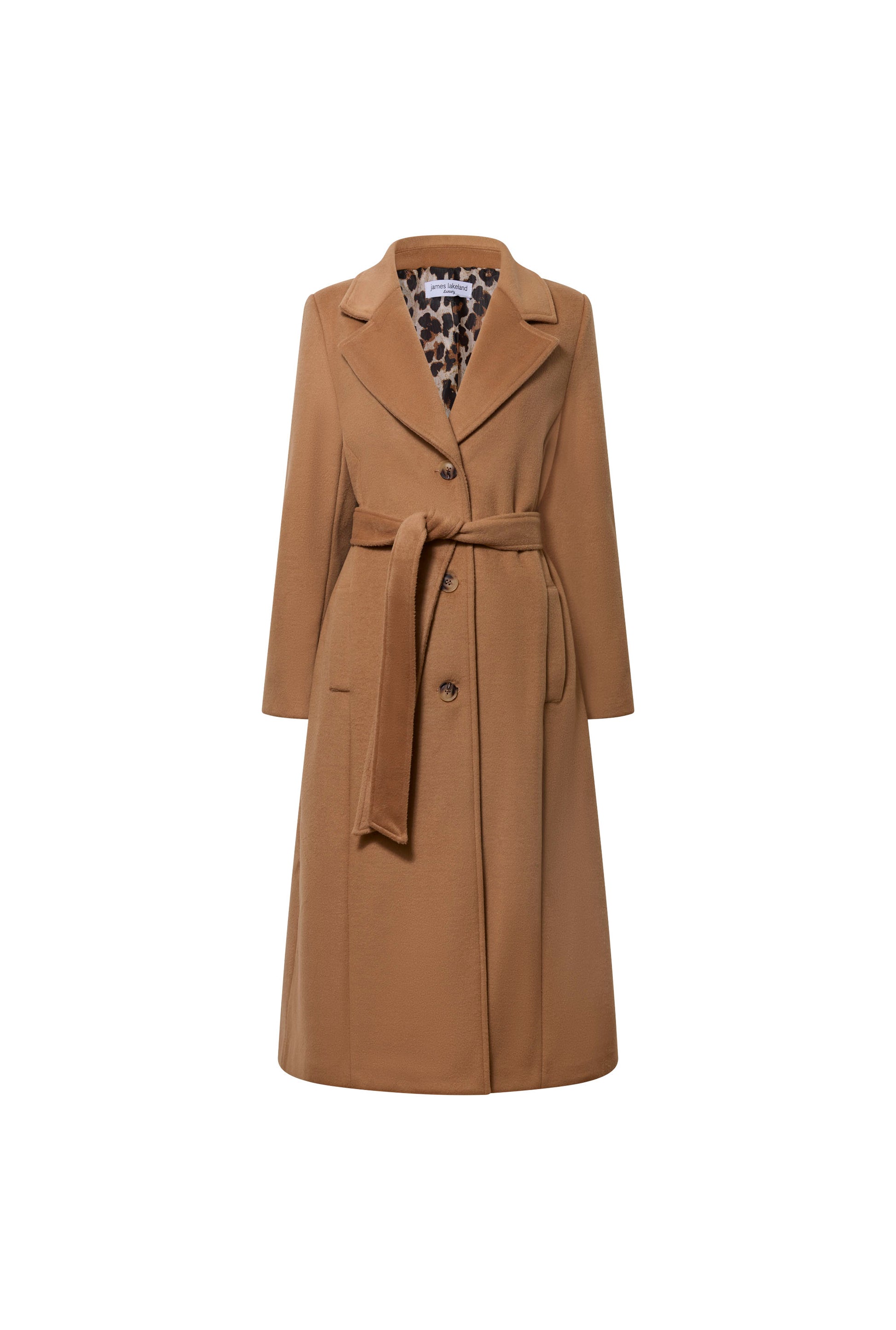 James Lakeland’s Camel Classic Coat features a tailored silhouette with notched lapels, belted waist, two side pockets, and marble-look buttons. A bold leopard-print lining adds contrast, making this calf-length coat a refined yet statement-making winter essential.