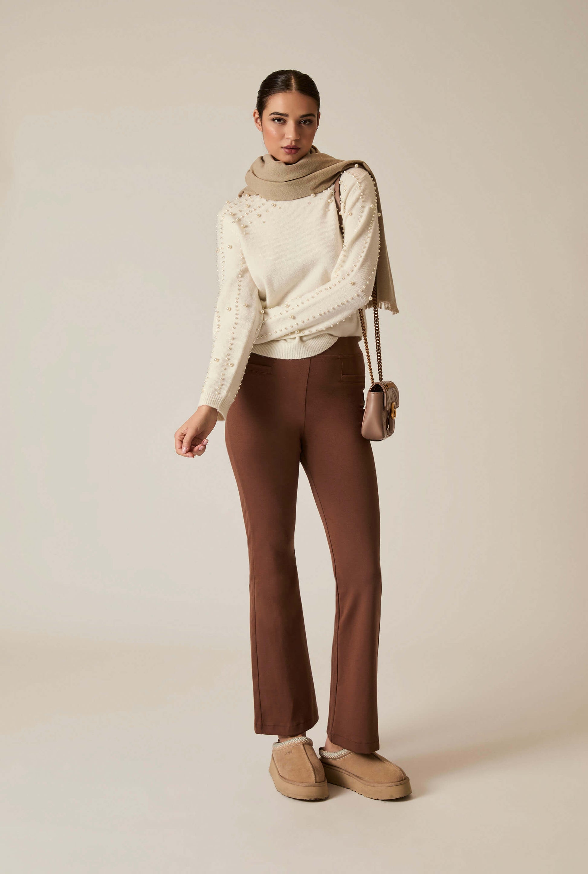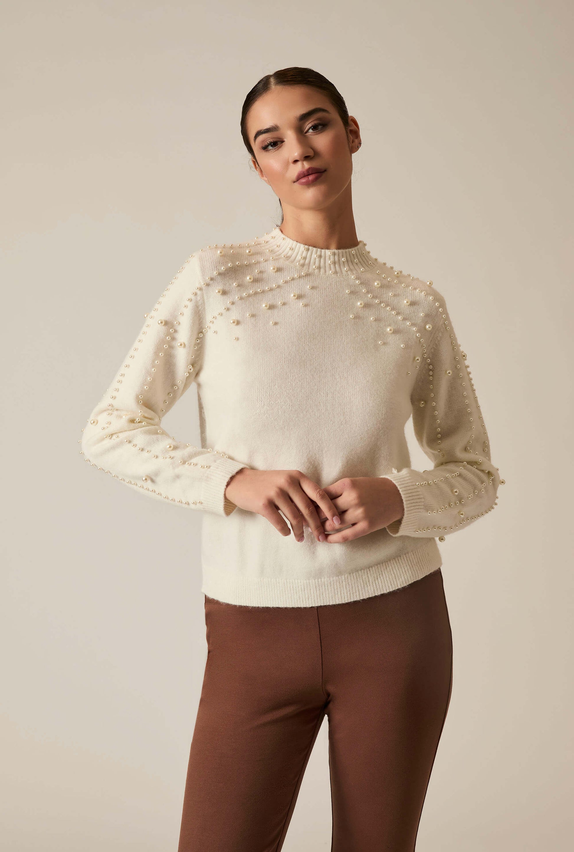 James Lakeland’s Cream Pearl Sleeve Jumper brings sculptural elegance to everyday knitwear. Featuring a high neckline and tonal pearl-style studs arranged in vertical and diagonal lines across the shoulders and sleeves.