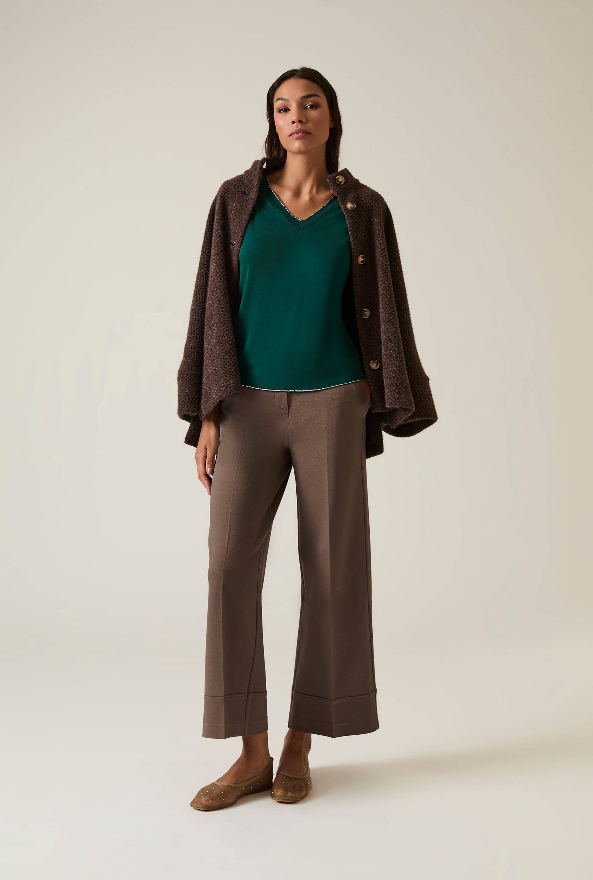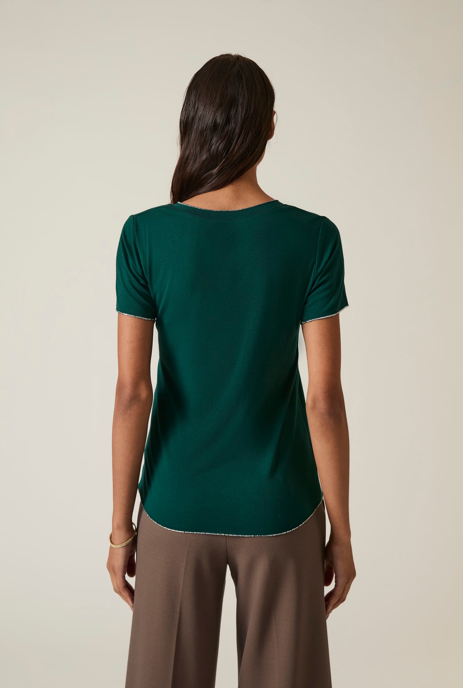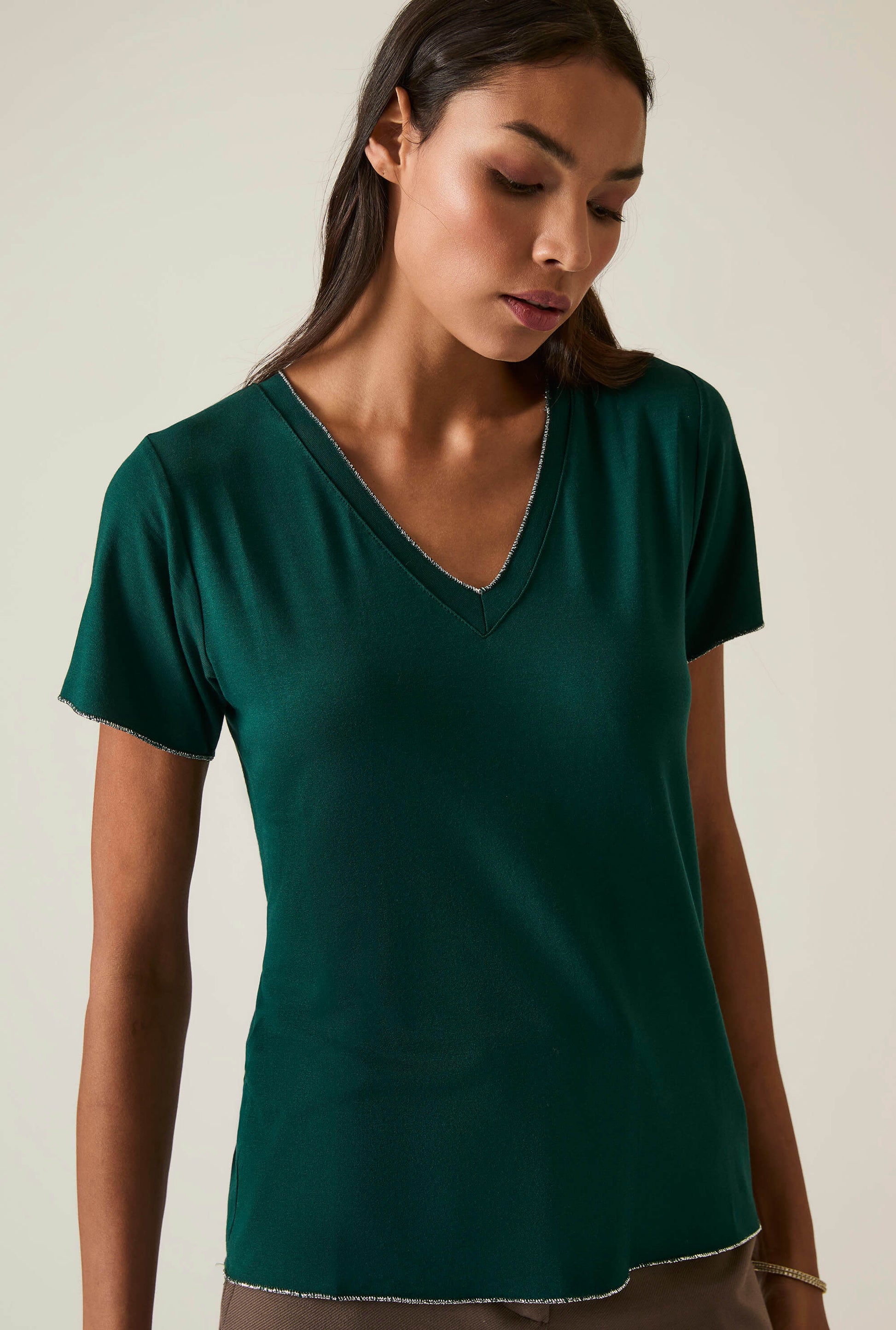 This understated yet chic James Lakeland dark green V-neck t-shirt is thoughtfully designed in the softest natural viscose. It features elegant Lurex detailing along the V-neck, short sleeves, and hem. Slightly tailored at the waist, this supple t-shirt is a perfect addition to your wardrobe.
