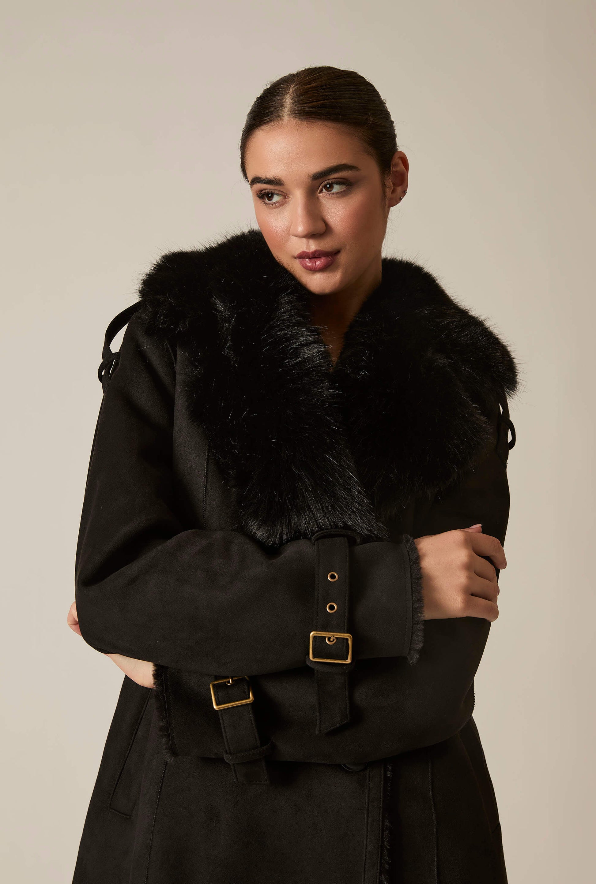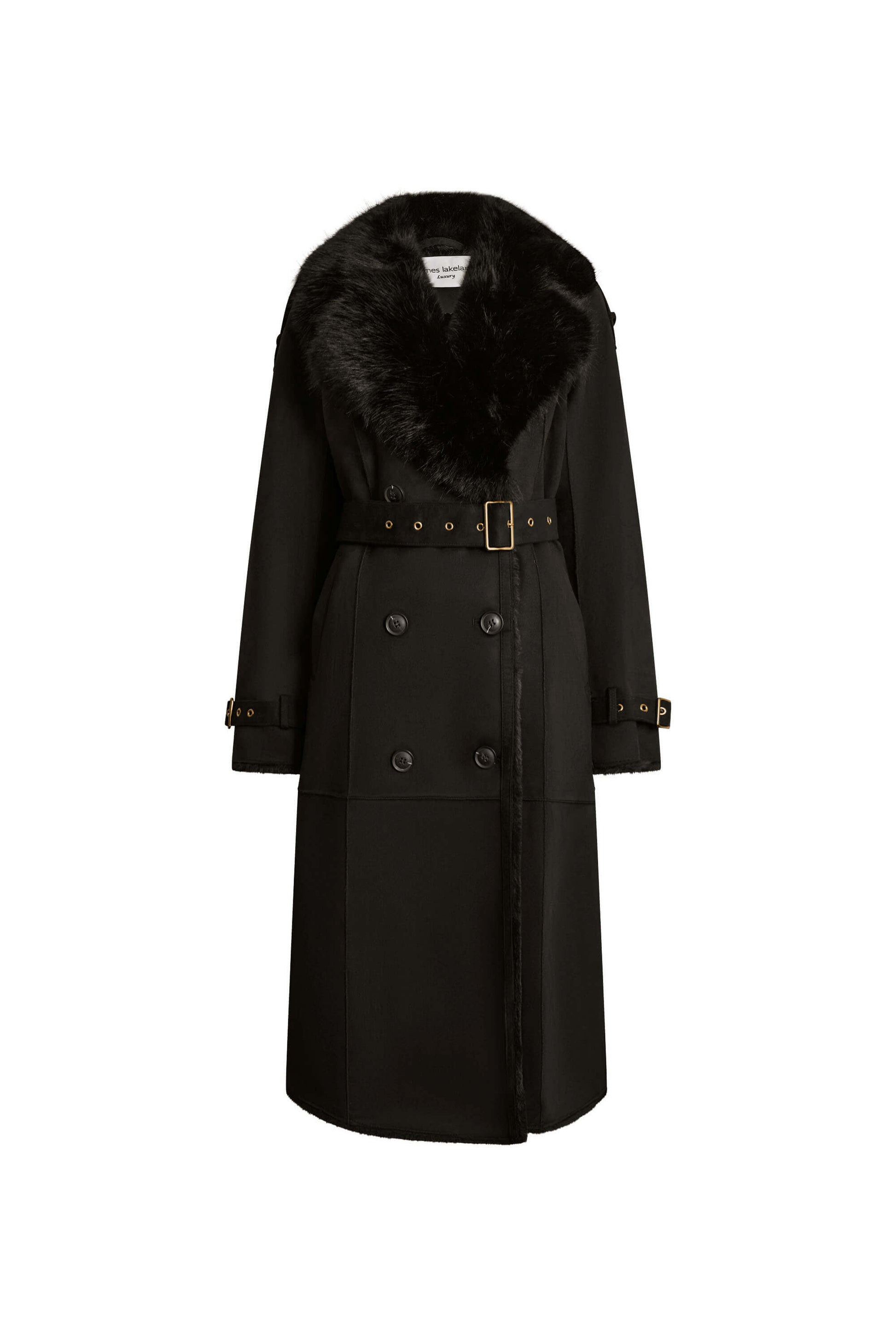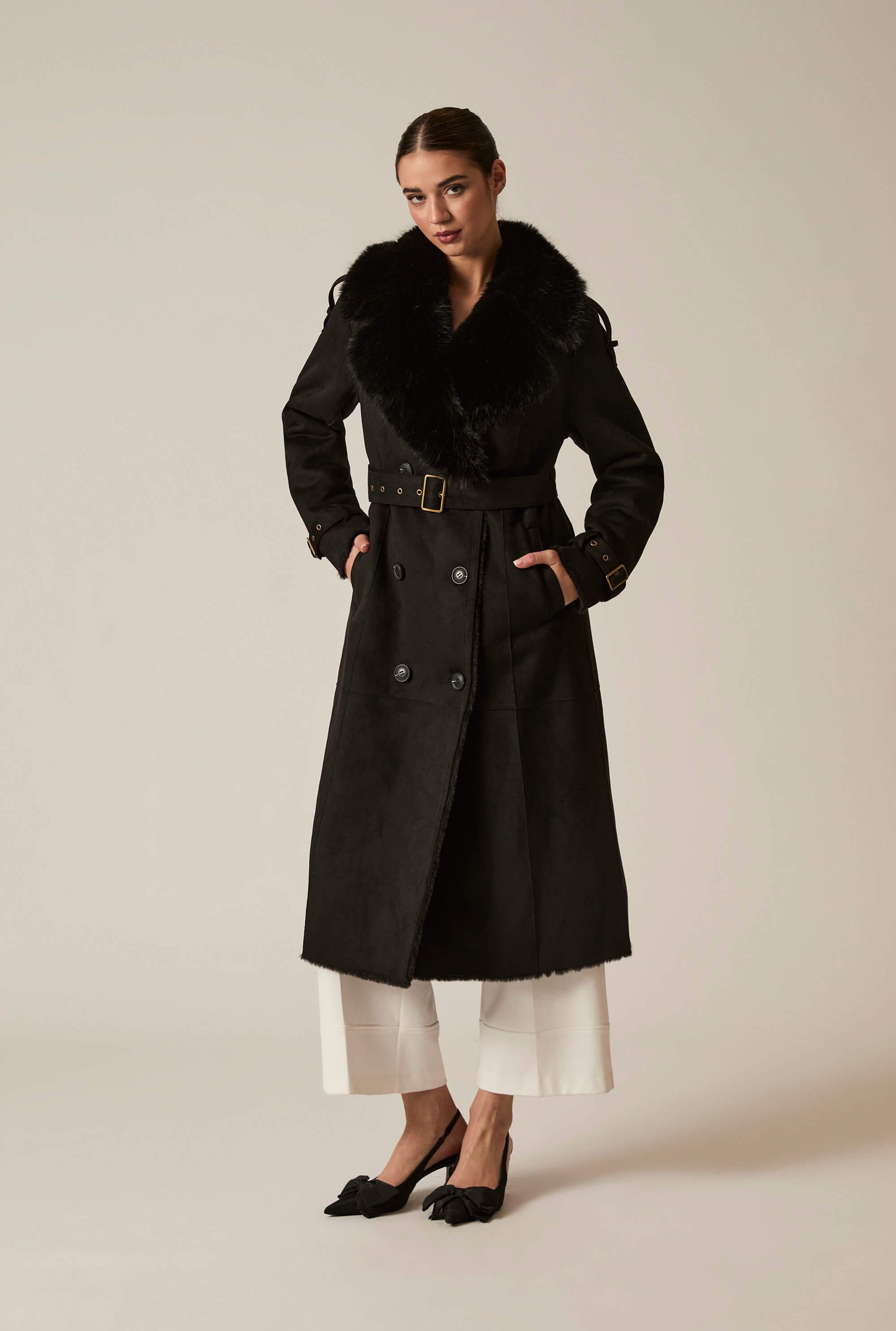 James Lakeland’s double-breasted black suede coat features six marble-effect buttons, a matching waist belt, and buttoned sleeve straps. Structured shoulders and a dramatic faux fur collar add warmth and elegance. A bold winter piece with timeless sophistication.
