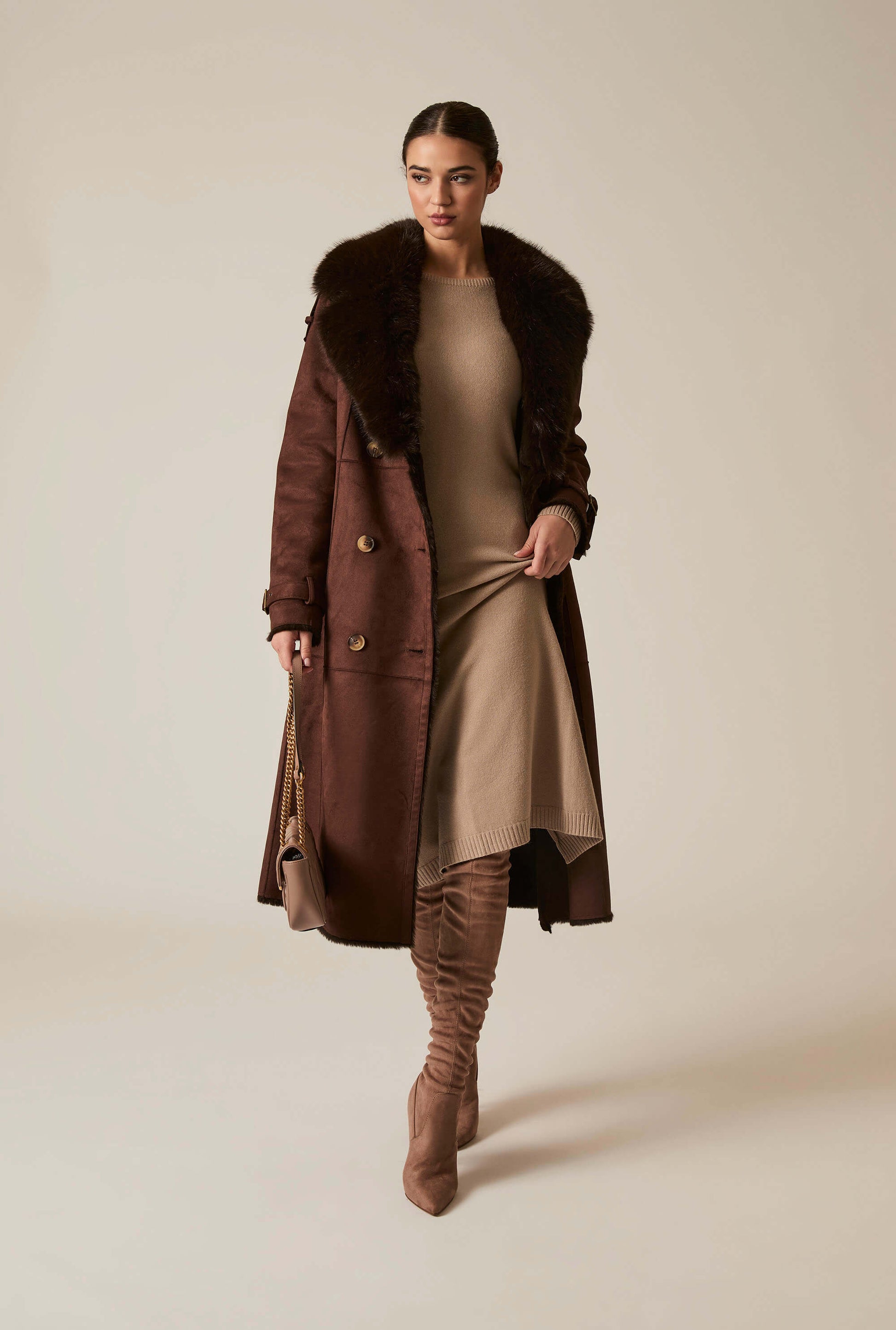 James Lakeland’s double-breasted brown suede coat features six marble-effect buttons, a matching waist belt, and buttoned sleeve straps. Structured shoulders and a dramatic faux fur collar add warmth and elegance. A bold winter piece with timeless sophistication.