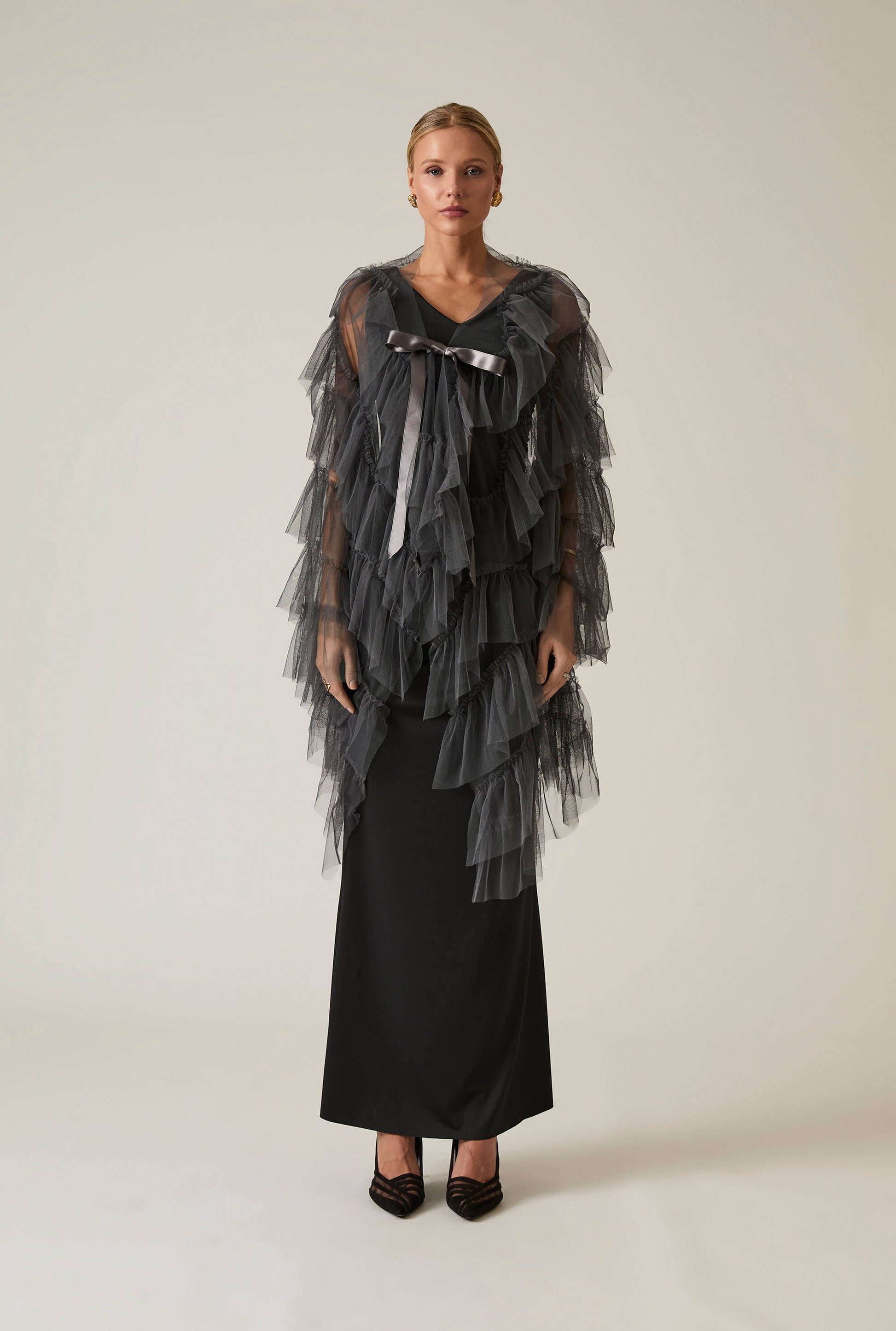 James Lakeland’s Organza Grey Shawl is a one-size statement piece designed to transform any outfit. Crafted from sheer, layered organza with cascading ruffles and a matching silky ribbon at the neckline, it adds volume, texture, and theatrical elegance. Whether draped over eveningwear or styled as a sculptural overlay, this shawl brings movement and artistry to formal dressing.