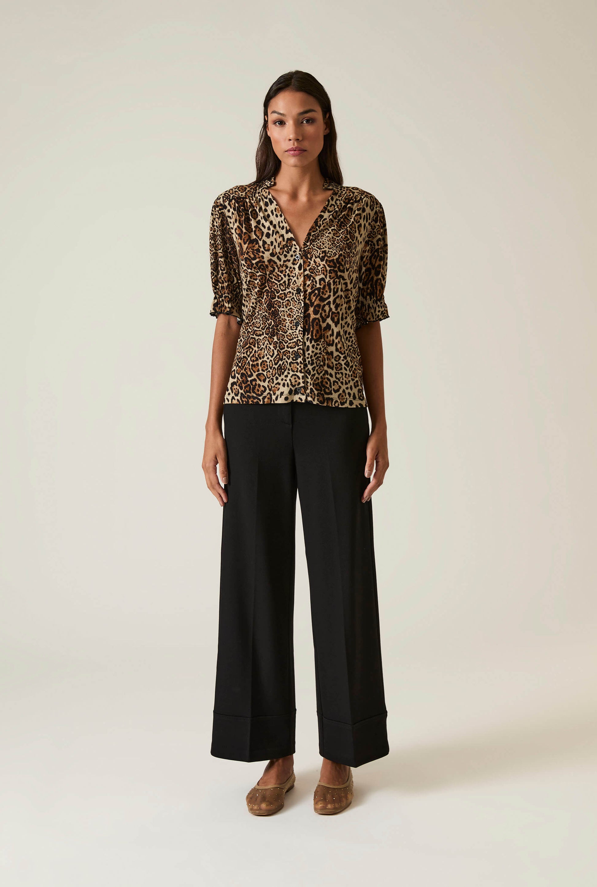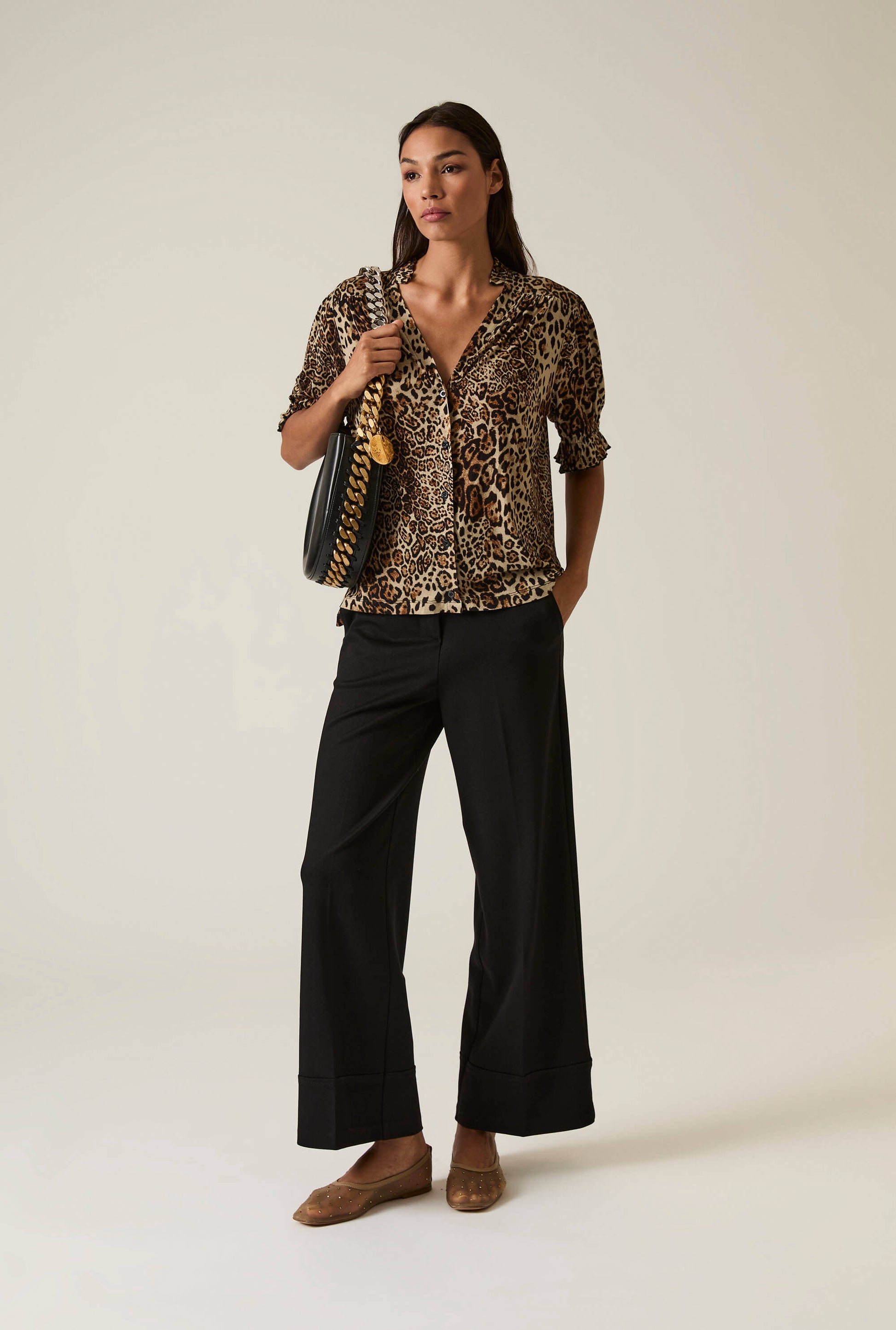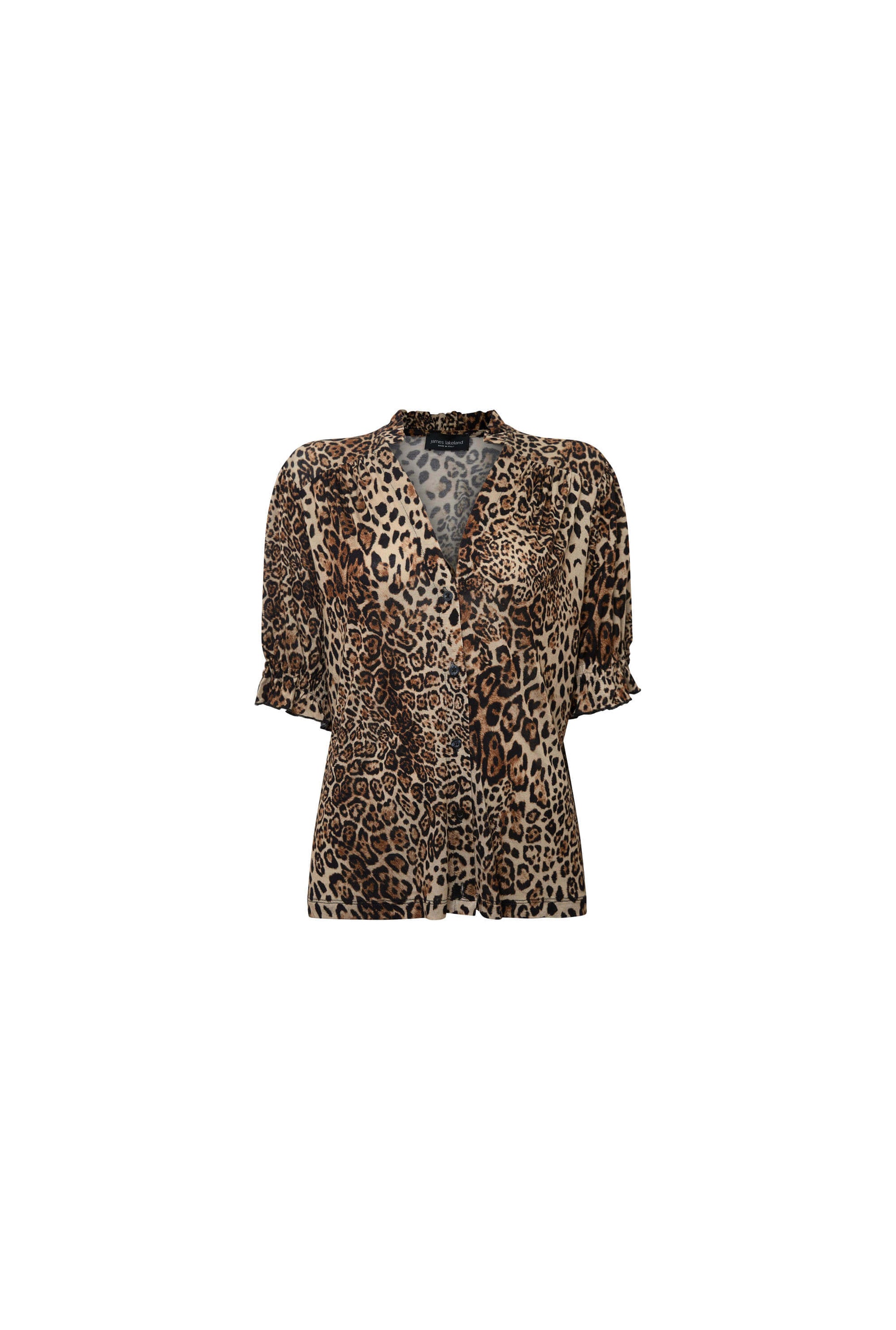 Leopard Jersey Blouse by James Lakeland crafted in premium Italian jersey for comfort and ease. Designed with a structured V-neckline, softly gathered ruffled collar, and subtly shaped shoulders for a tailored fit. Features elbow-length sleeves with smocked cuffs and a full button-front closure. Suitable for day-to-evening wear.