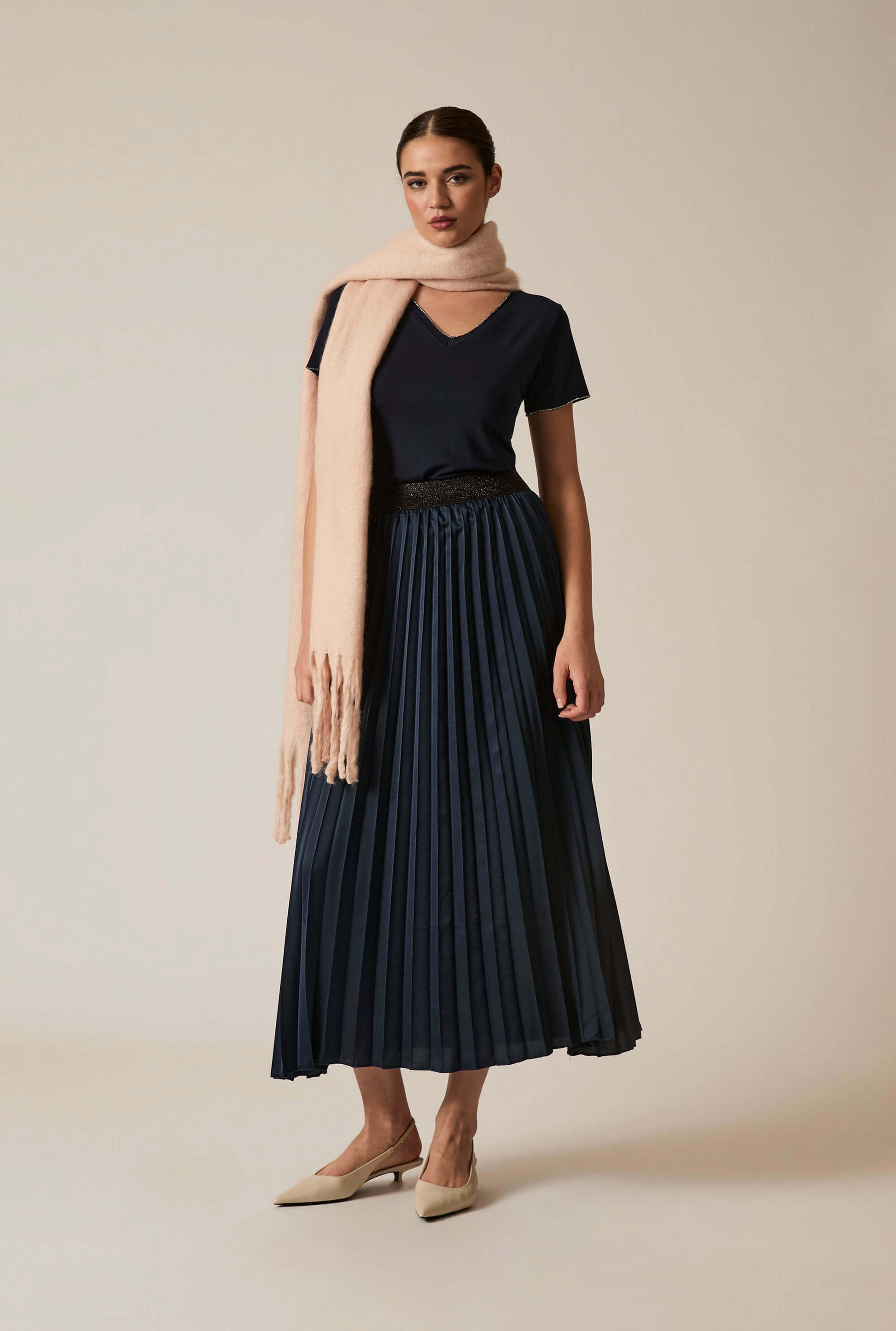 James Lakeland navy pleated maxi skirt with high waist and textured waistband. Crisp vertical pleats create elegant movement and an A-line silhouette with a relaxed, flowing fit. A versatile piece for refined daywear or elevated evening looks.
