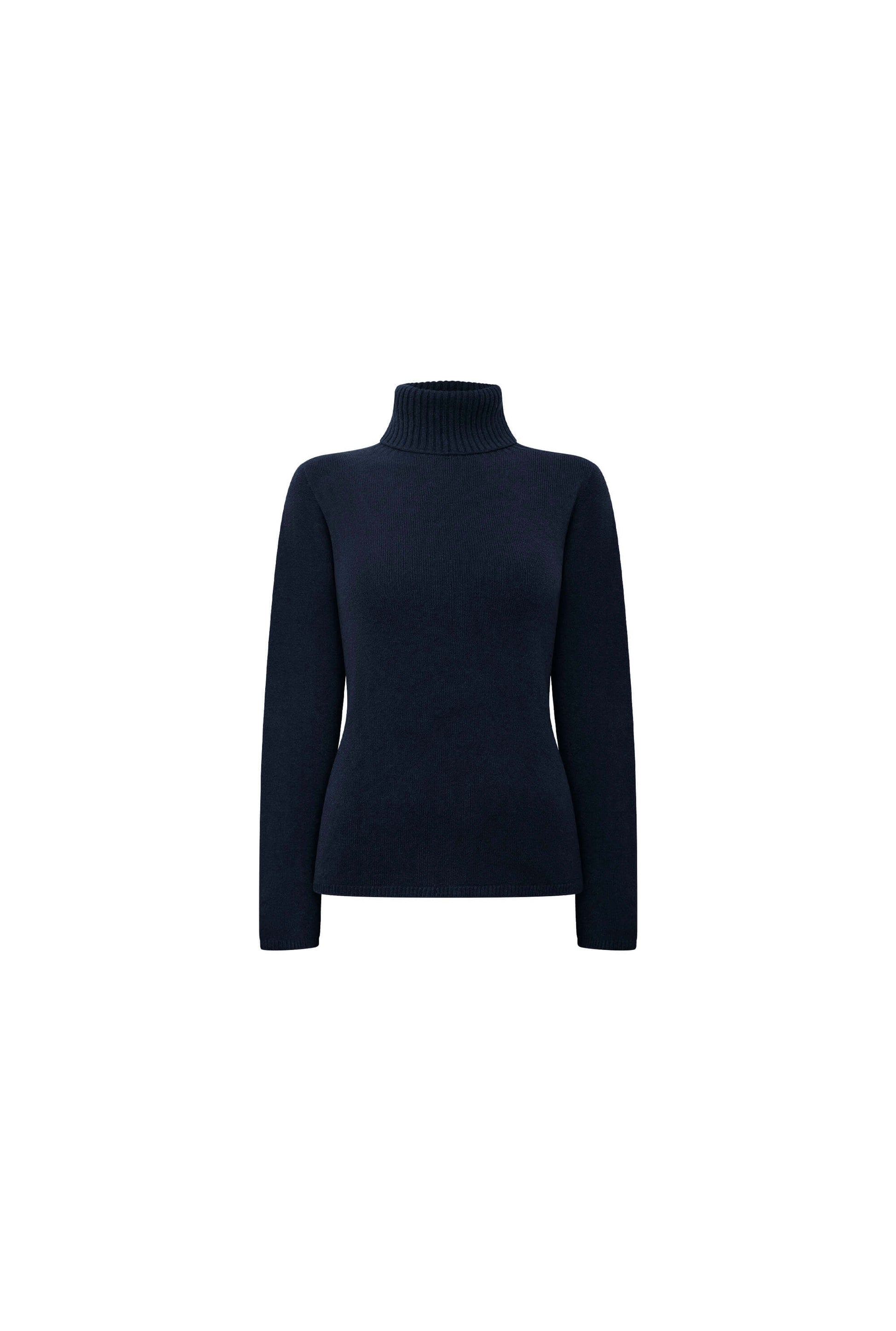 James Lakeland Navy Polo Neck Jumper. Made in Italy from soft knit with a high ribbed polo neck for warmth and elegance. Features long sleeves with ribbed cuffs and subtly shaped ribbed hems for a flattering fit. A timeless piece for layering or solo wear.