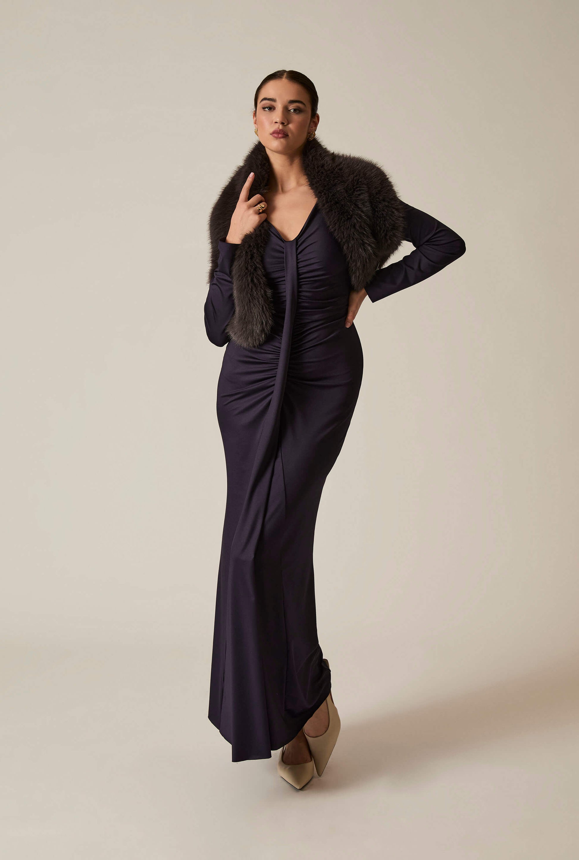 James Lakeland’s Navy Sculpted Long Sleeve Dress is a slip-on style that blends structure with softness. Featuring a modest V-neckline, full-length sleeves, and central ruching that sculpts the silhouette, it’s designed to flatter from every angle. The floor-length cut and smooth, drapey fabric create an elegant line, perfect for formal evenings and elevated occasions.