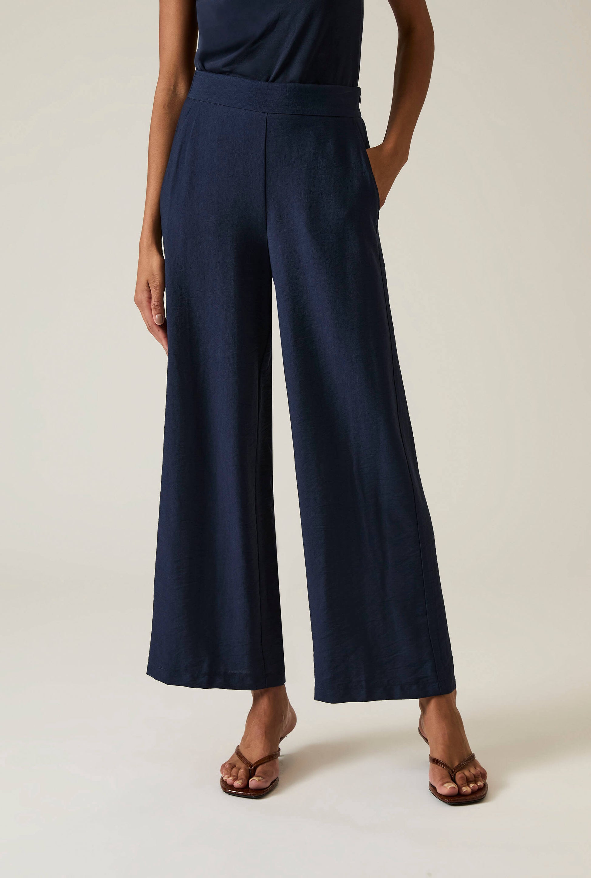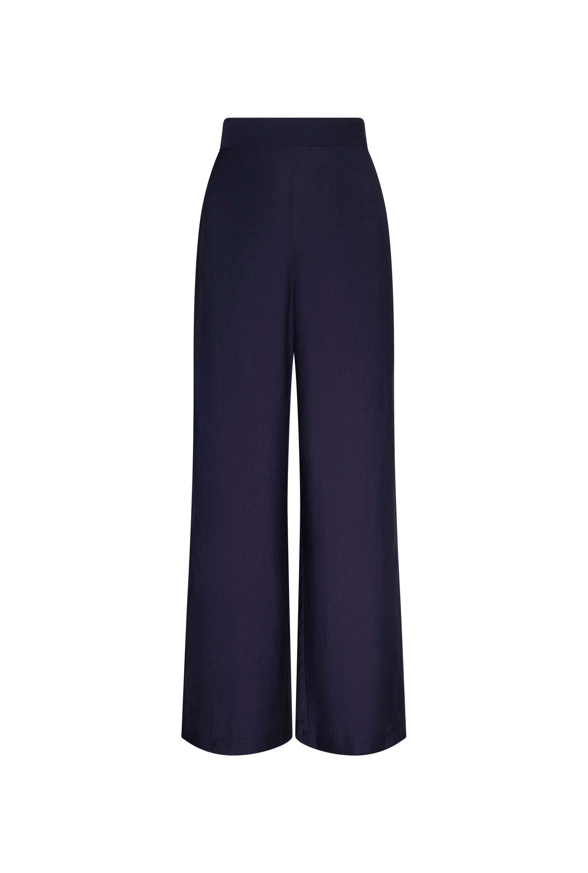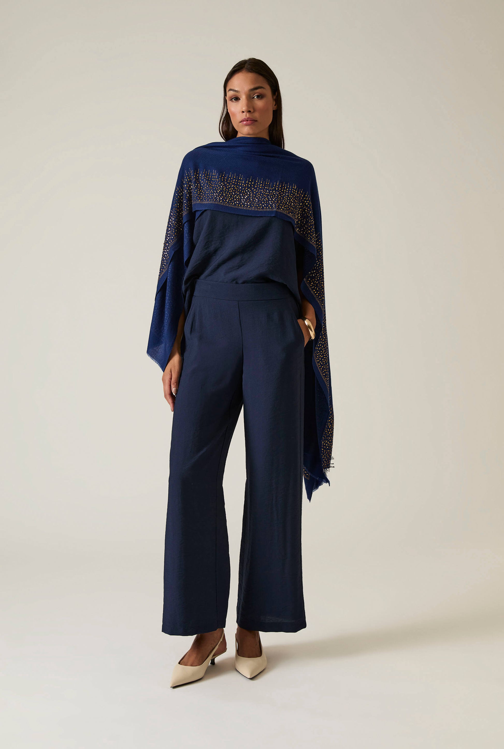 James Lakeland high-rise navy wide-leg trousers with subtle texture, invisible side zip, and stretch waistband at the back. Elegant and versatile — pair with our Navy Gathered Sleeve Blouse for a sleek, coordinated look. Perfect for work or evening wear.