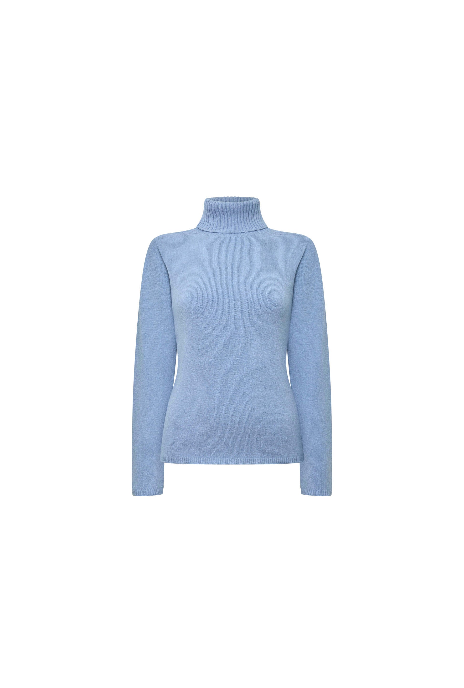 James Lakeland Pale Blue Polo Neck Jumper. Made in Italy from soft knit with a high ribbed polo neck for warmth and elegance. Features long sleeves with ribbed cuffs and subtly shaped ribbed hems for a flattering fit. A timeless piece for layering or solo wear.
