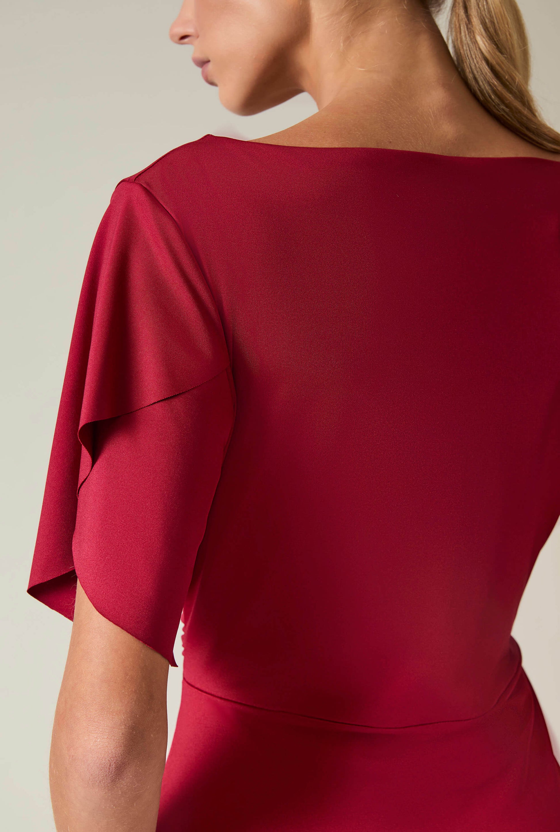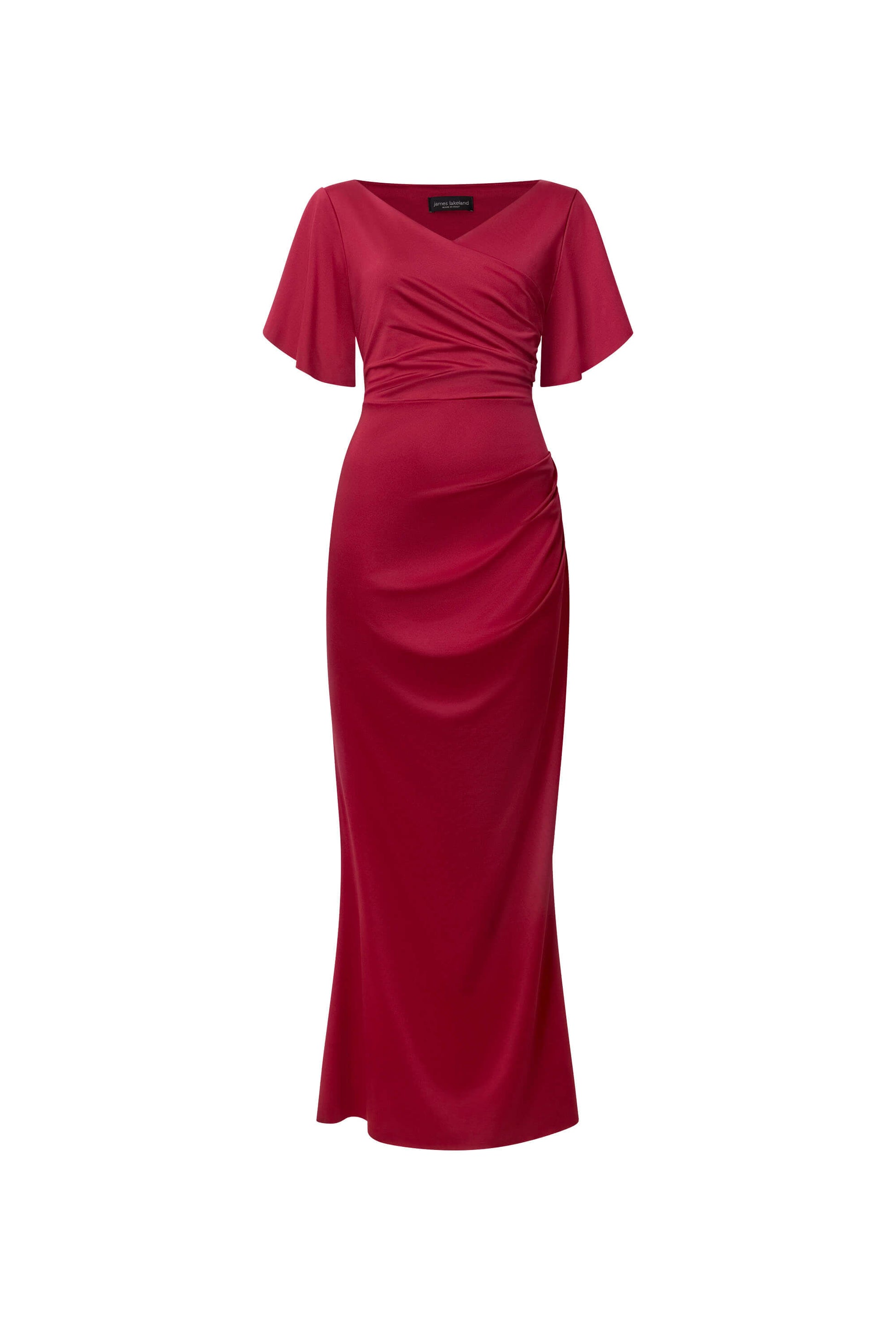 Slip into elegance with the Red Gathered Maxi Dress. Featuring a soft V-neckline, short flutter sleeves, and a crossover bodice with flattering ruching, this floor-length silhouette flows with ease. Smooth, drapey fabric adds comfort and shine to every occasion.