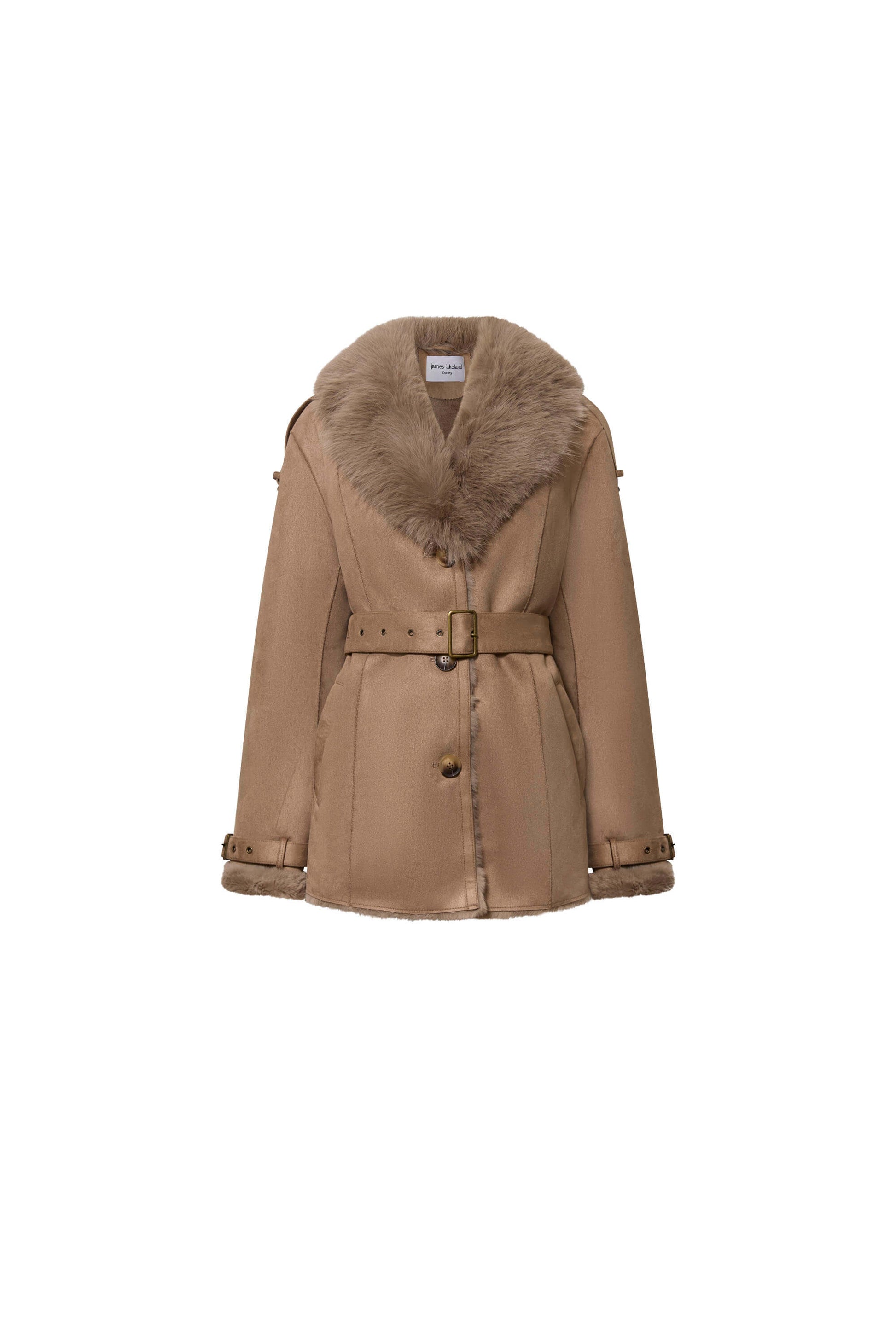 James Lakeland’s single-breasted tan faux fur coat jacket sits at hip length, with a plush collar, marble-effect buttons, and a belted waist with matching buckle. Faux fur-trimmed cuffs, buttoned shoulder epaulets, and stitched detailing complete this structured winter essential.