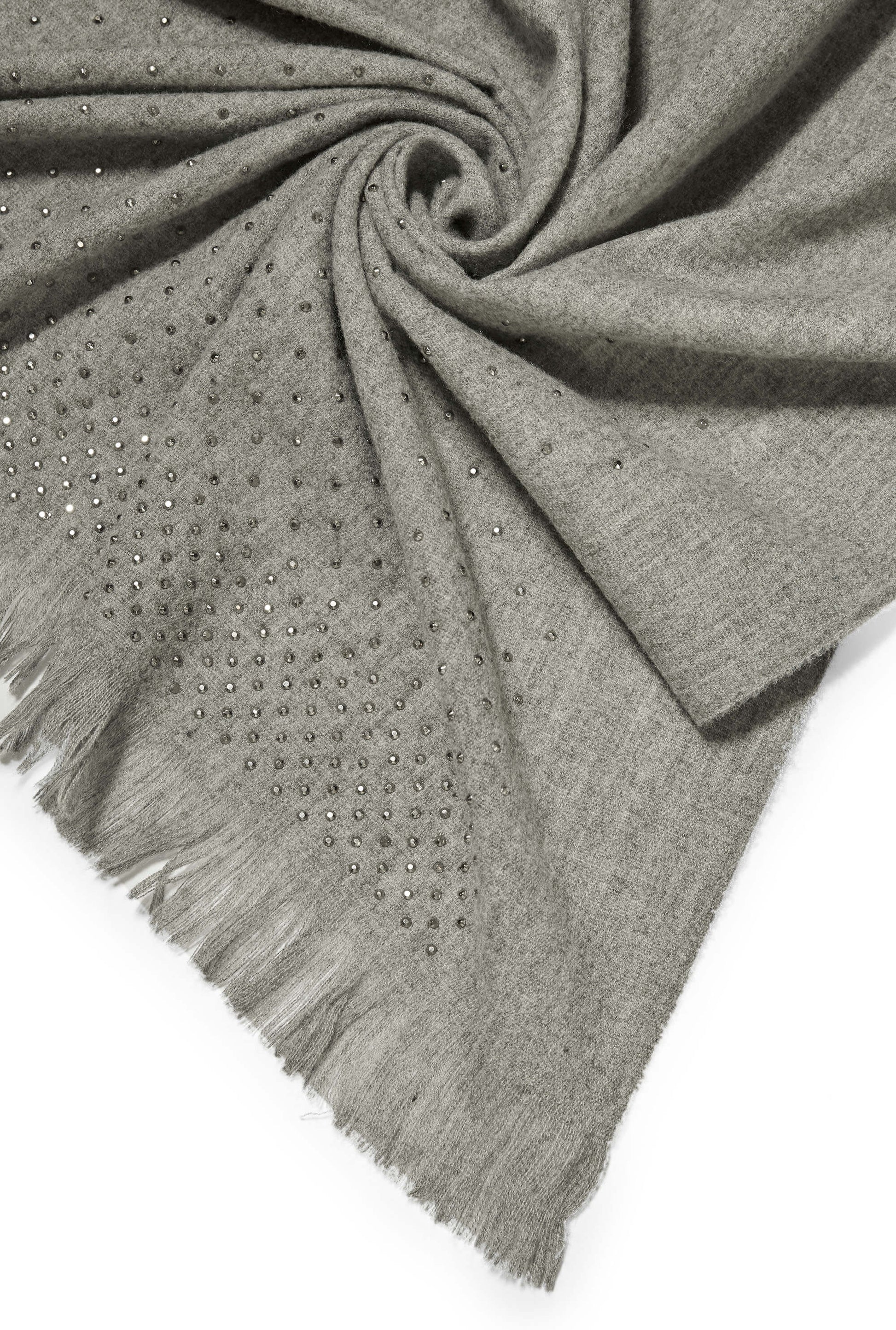 Elegant grey scarf adorned with sparkling Swarovski stones scattered throughout and finished with delicate tassels. A luxurious accessory that adds shimmer and sophistication to any outfit.
