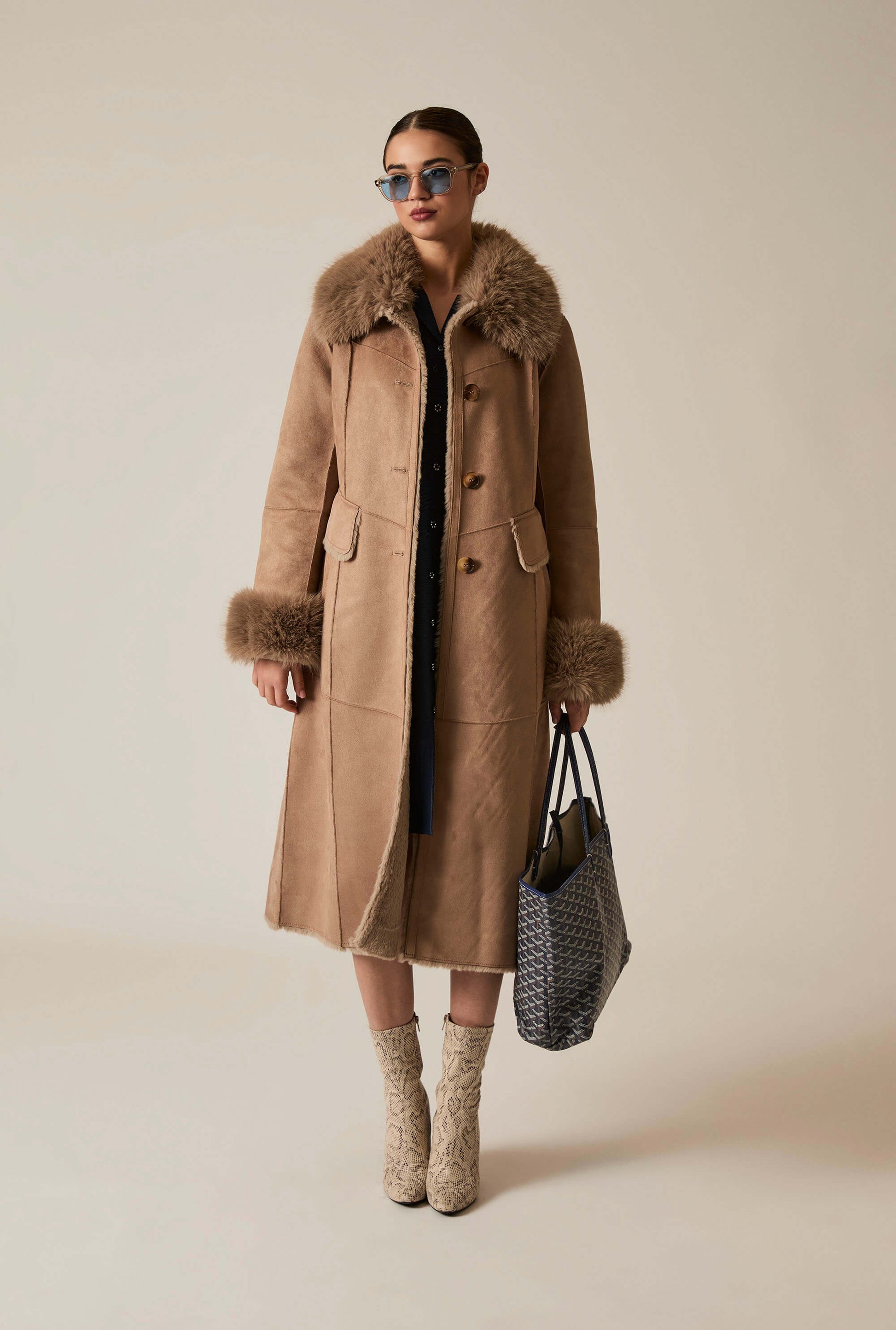 James Lakeland’s single-breasted taupe faux fur coat features a plush shawl collar, marble-effect buttons, and faux flap pockets at the waist with hidden side entry. Faux fur-trimmed cuffs and suede-look texture add depth, while the tailored silhouette delivers dramatic winter elegance.