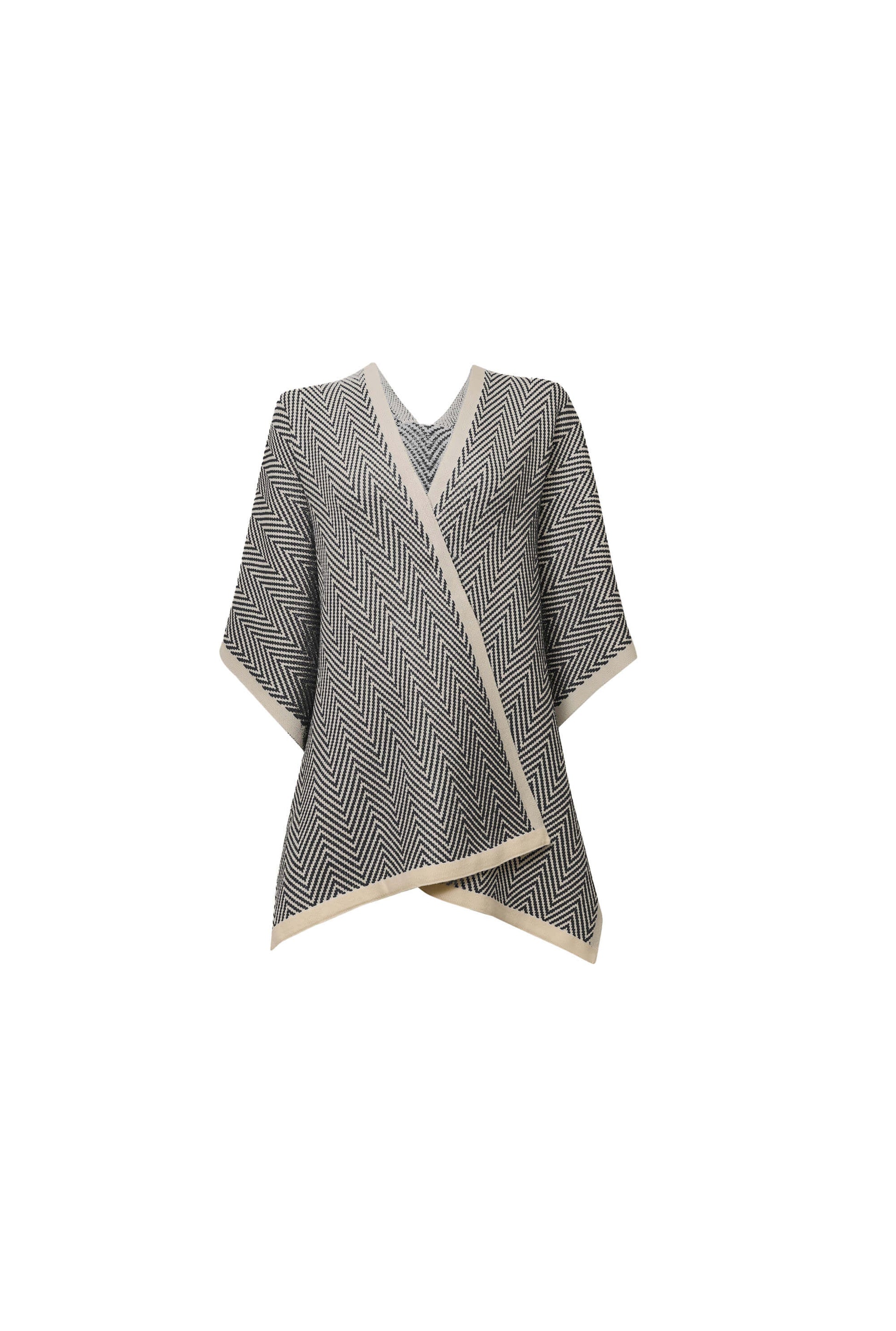 Elevate your everyday layers with this beige and black chevron poncho from James Lakeland. The textured weave is framed by a soft cream trim, creating a refined contrast that highlights the modern pattern. Designed with a relaxed drape and subtle side‑button detail, it slips effortlessly over any outfit, adding warmth, comfort, and polished style in one versatile piece.