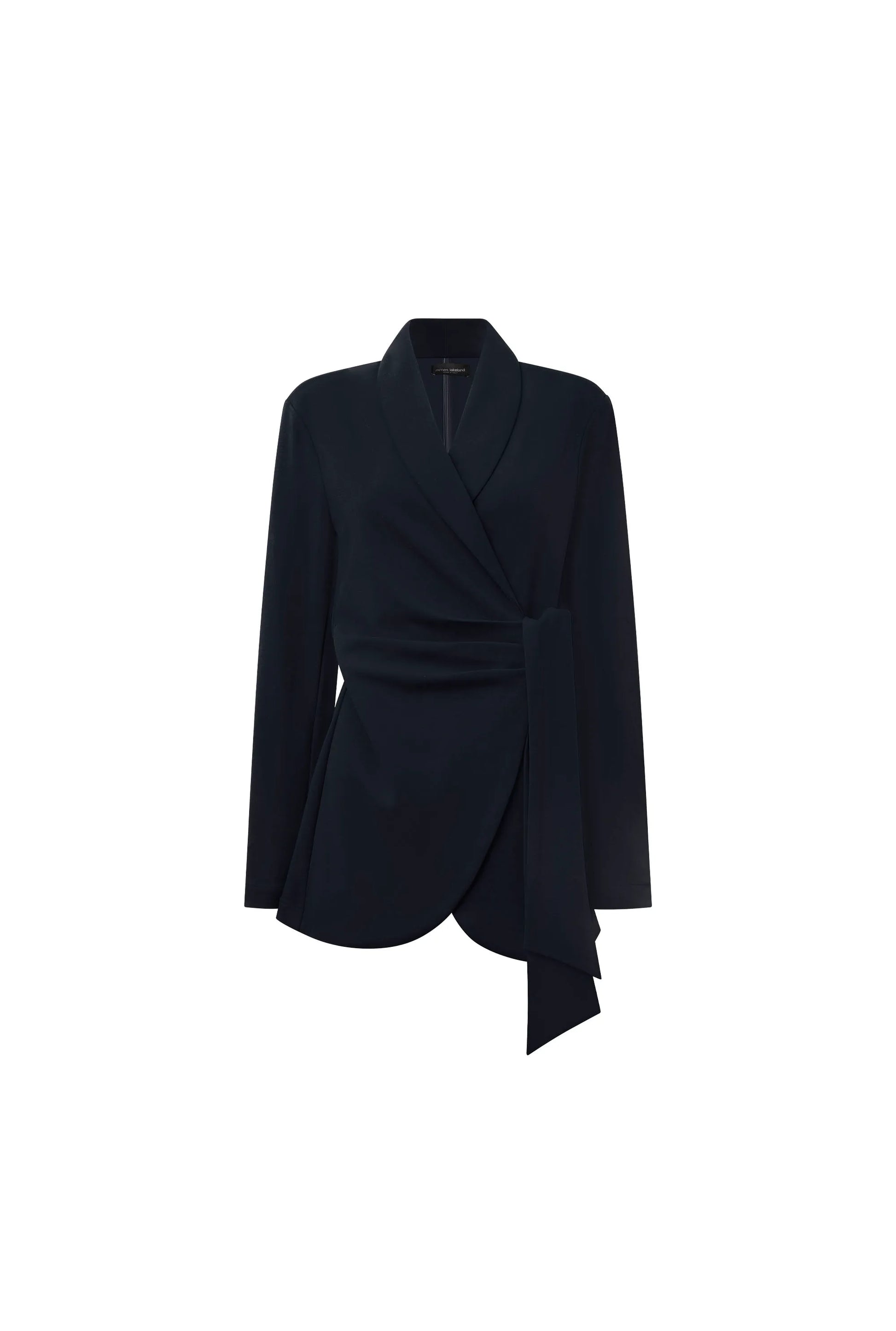 A sophisticated wrap blazer in deep navy, crafted in Italy. The distinctive side sash detail and tailored silhouette create an elegant, statement look, whilst the structured fit adds refined sophistication.