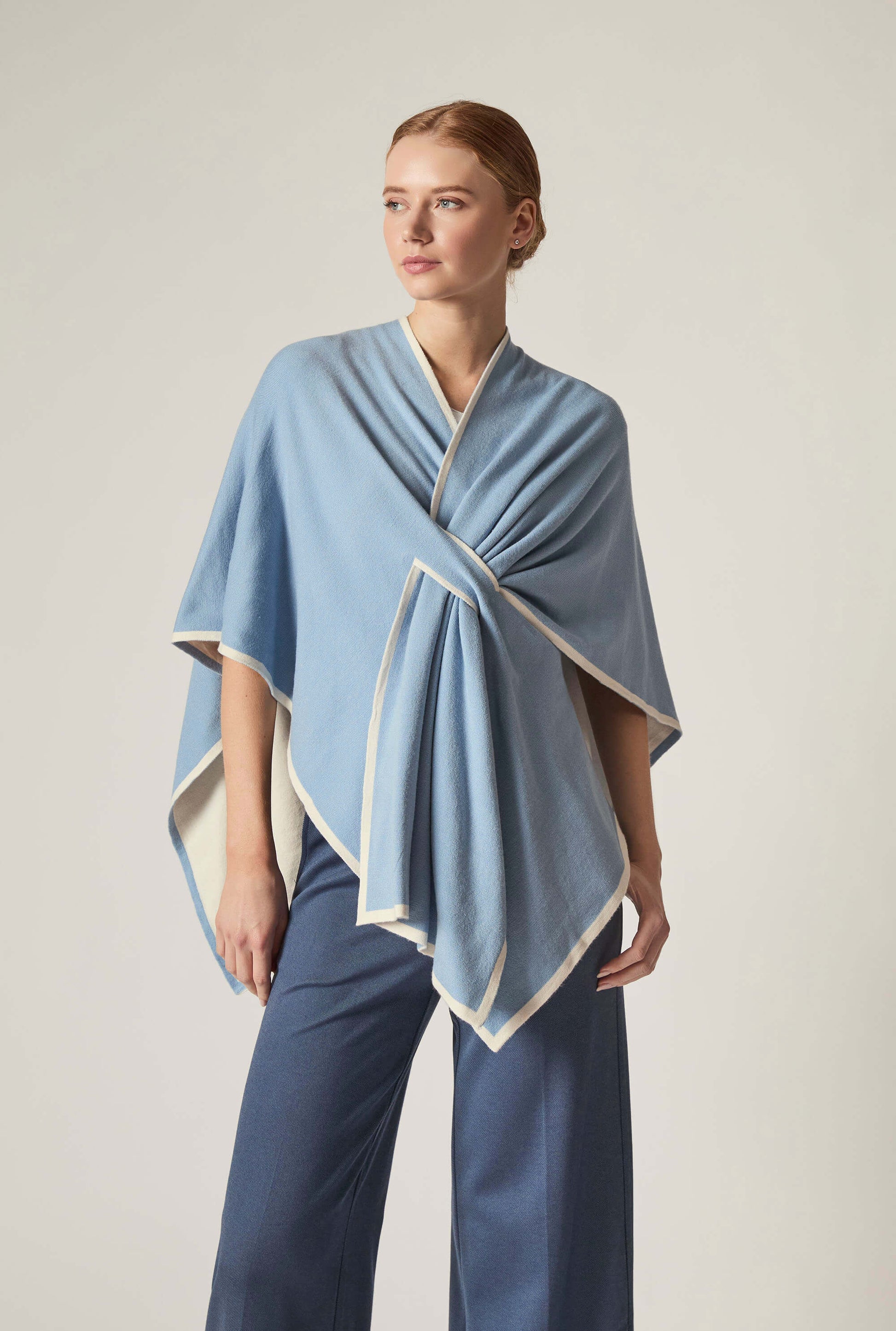 A lightweight pale blue poncho featuring a signature front‑knot detail that shapes the garment and adds subtle volume. Finished with a contrasting trim, it layers easily over long‑sleeve tops for transitional styling. Soft to the touch and designed for everyday comfort with a polished finish.
